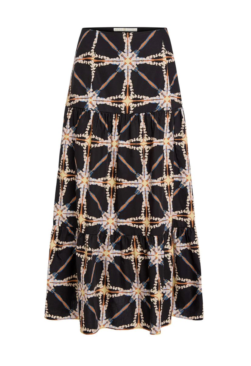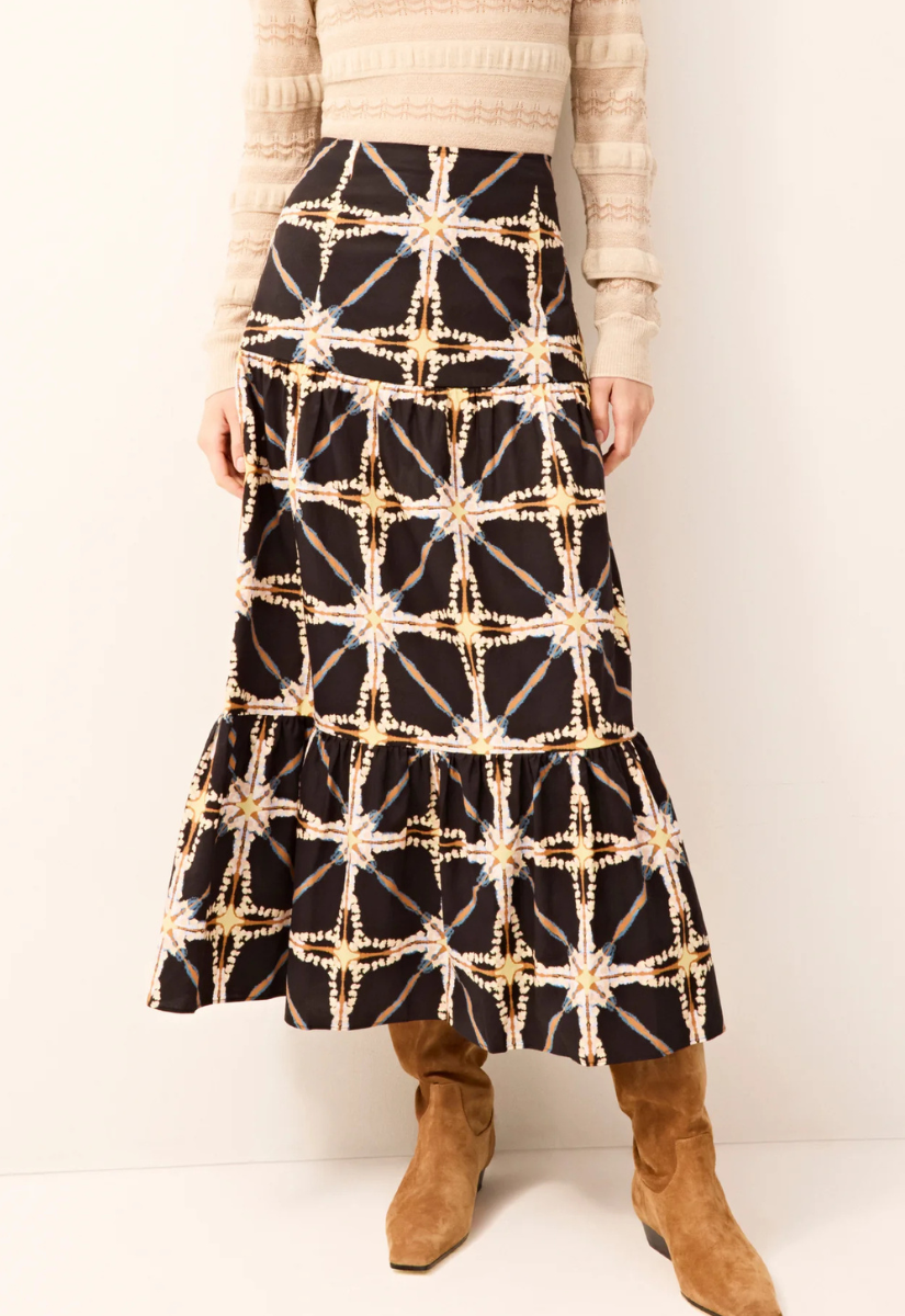 A tiered printed maxi skirt like our new Hines silhouette is a Marie Oliver staple, no matter the season. Shown here in Polaris—a fashion-forward take on tie-dye in a neutral winter palette—Hines brings ease and elegance to year-round dressing.