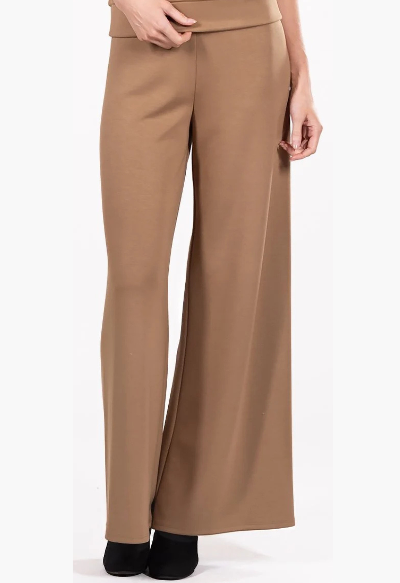 These camel-colored wide-leg pants feature a smooth, tailored fit with a flattering high waistband for a sleek silhouette. Effortlessly chic and versatile, they can be dressed up with heels or worn casually with flats for a polished everyday look.