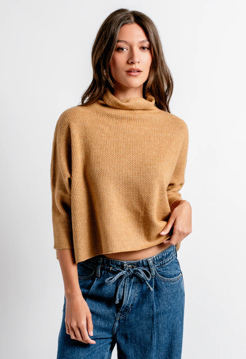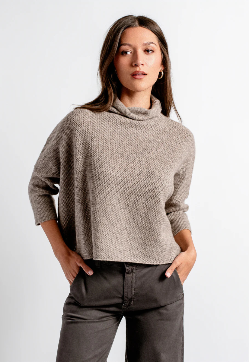 The same silhouette as everyone's favorite Aja sweater, but jazzed up a bit! Featuring a turtleneck, and criss-cross stitch material!