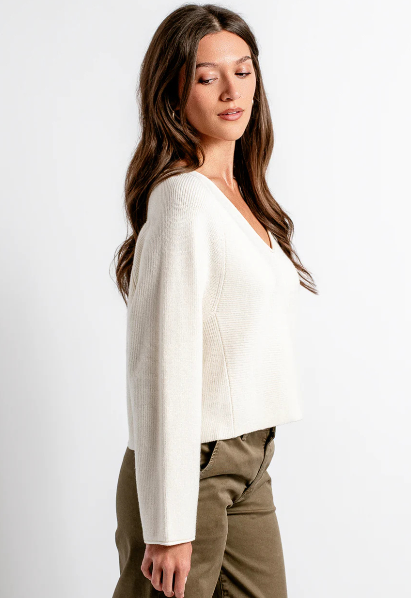 V-neck top with long raglan sleeve, center front piping and roll hem accents