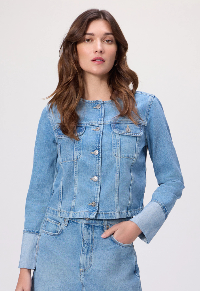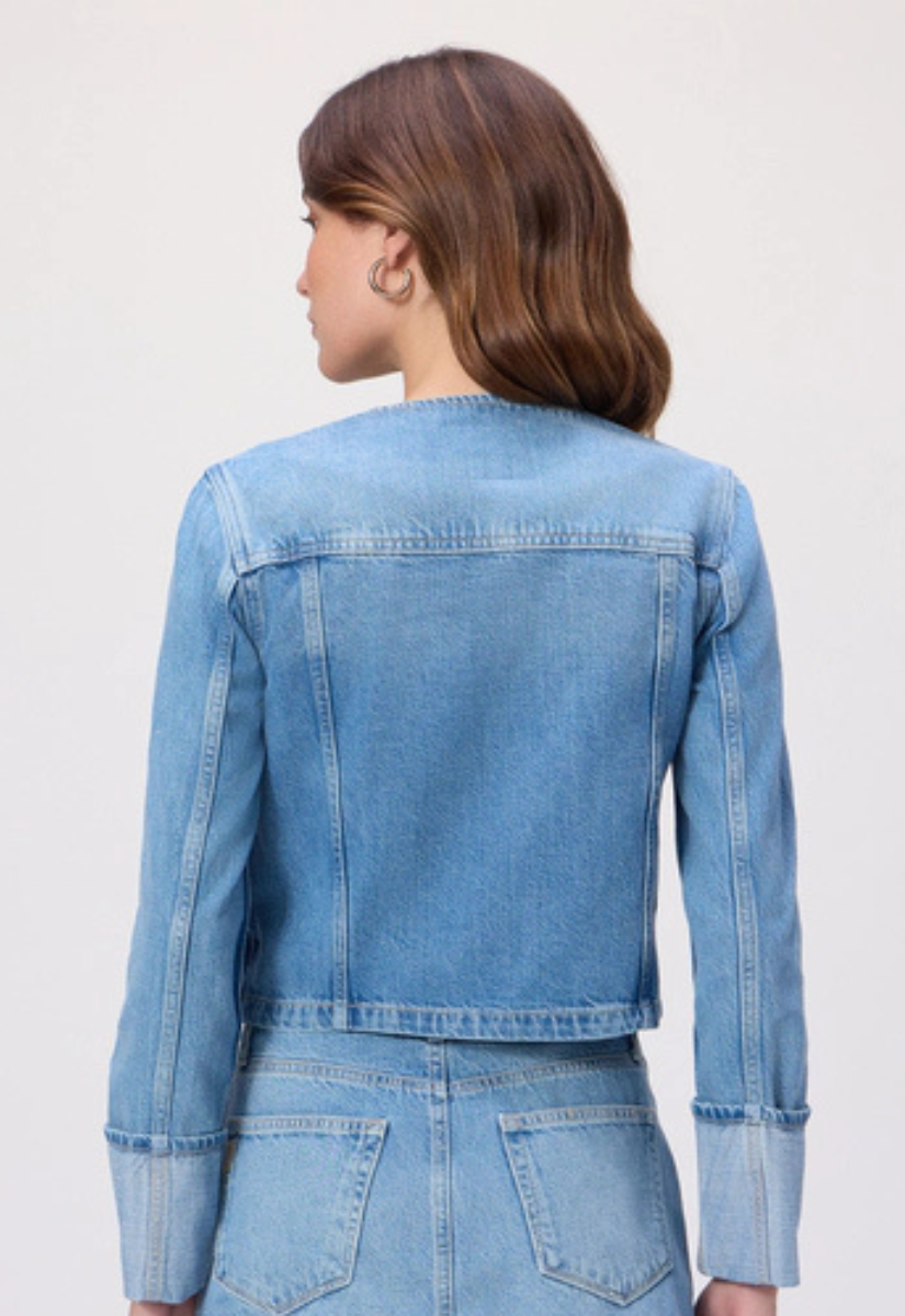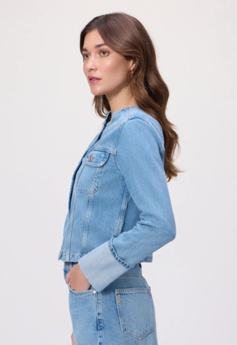 The Dean Jacket is a collarless denim trucker, featuring wide cuffs and a clean, modern silhouette. In a light wash with double chest pockets, silver buttons, and seaming details, this style is crafted from our Rigid denim with a soft hand-feel for premium comfort.