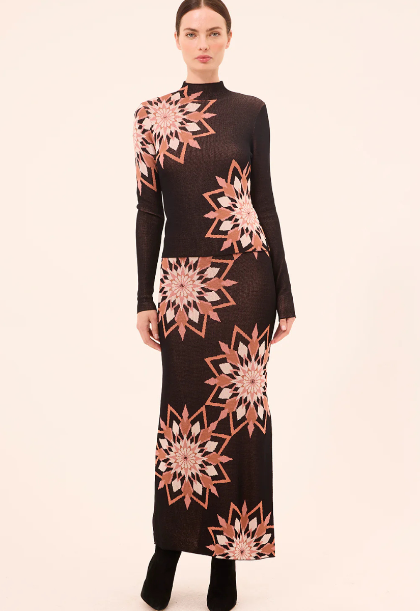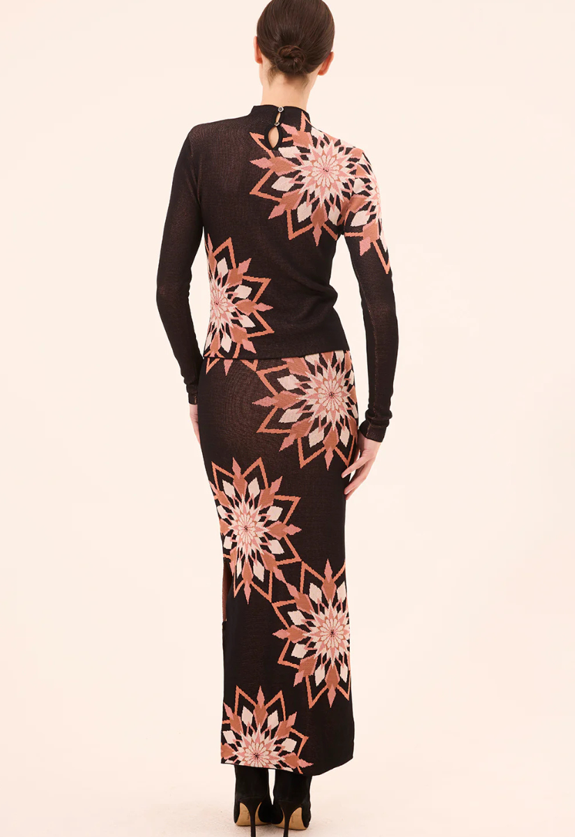 The Elowen top is crafted from stretch knit jacquard in our striking Kaleidoscope motif. Designed with long sleeves and a sleek turtleneck, it features a subtle keyhole back with button closure.