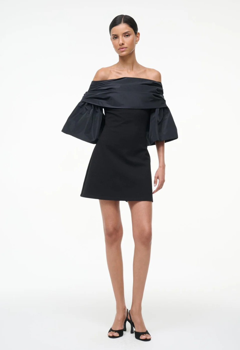 The Harper is a new ponte mini dress, featuring taffeta of the shoulder draped sleeves.