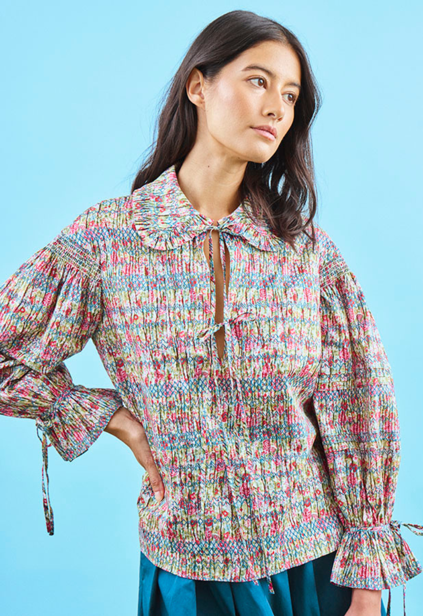 Introducing the Julia Top, crafted in smocked cotton from Liberty Fabrics. A soft ruffle collar frames the neckline, while pintuck detailing and pleated full sleeves add refined texture and movement. Designed with an easy pull over silhouette, Julia brings effortless sophistication to everyday dressing.