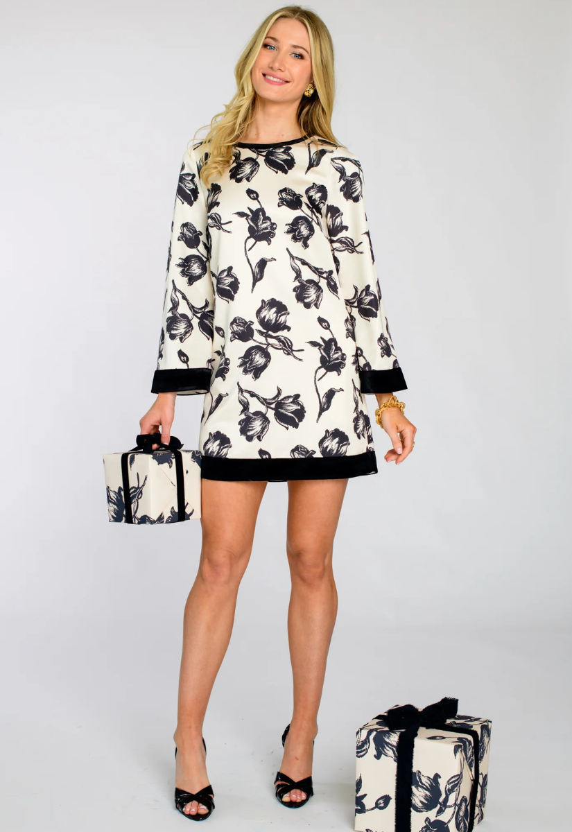 Juliette is the shift of the season with her bell sleeves and flattering silhouette. We love her in our Snow Tulip print with accents of black velvet trim.