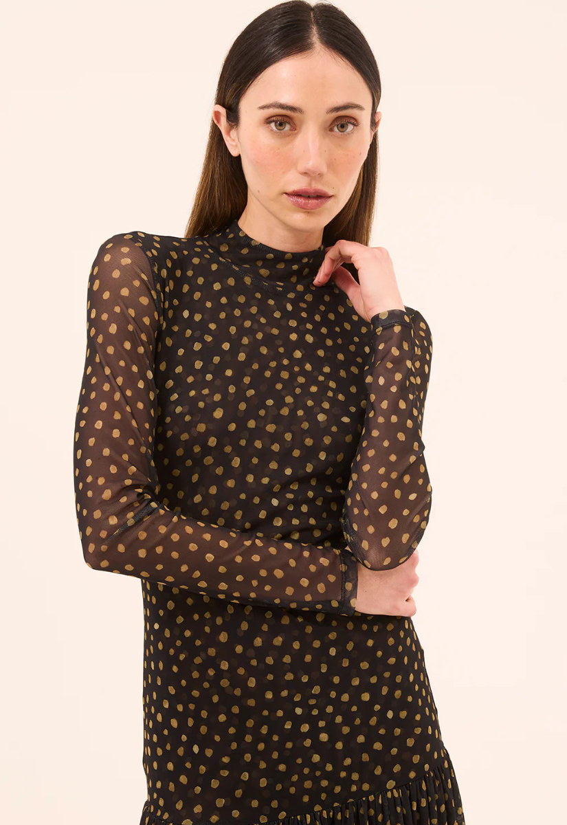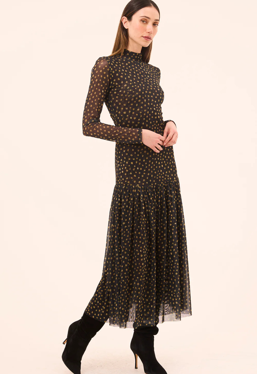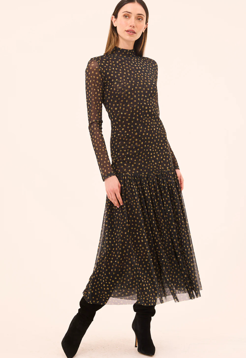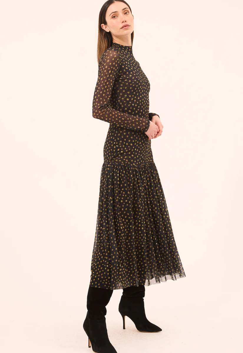 Leylani is a striking modern silhouette cut from our timeless Golden Polka Dot mesh on a black ground. This midi-length style features long sheer sleeves, a high neckline with a subtle mock neck, and a keyhole double-button back closure. The center back seam is intentionally offset, so pattern placement may vary. The fitted bodice flows into a drop waist and a double-lined skirt. Style it with everything from boots to heels for versatile, season-spanning wear.