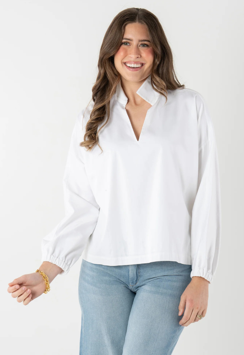 Clean, crisp, and endlessly versatile, the Long-sleeve Poppy in White Cotton Poplin is a wardrobe staple designed for year-round wear. Featuring a structured stand collar, long elastic dolman sleeves, and a relaxed silhouette, this top offers effortless comfort with a polished finish. The breathable cotton poplin keeps you cool, while the timeless design transitions seamlessly from casual outings to elevated lounging. A true capsule essential.