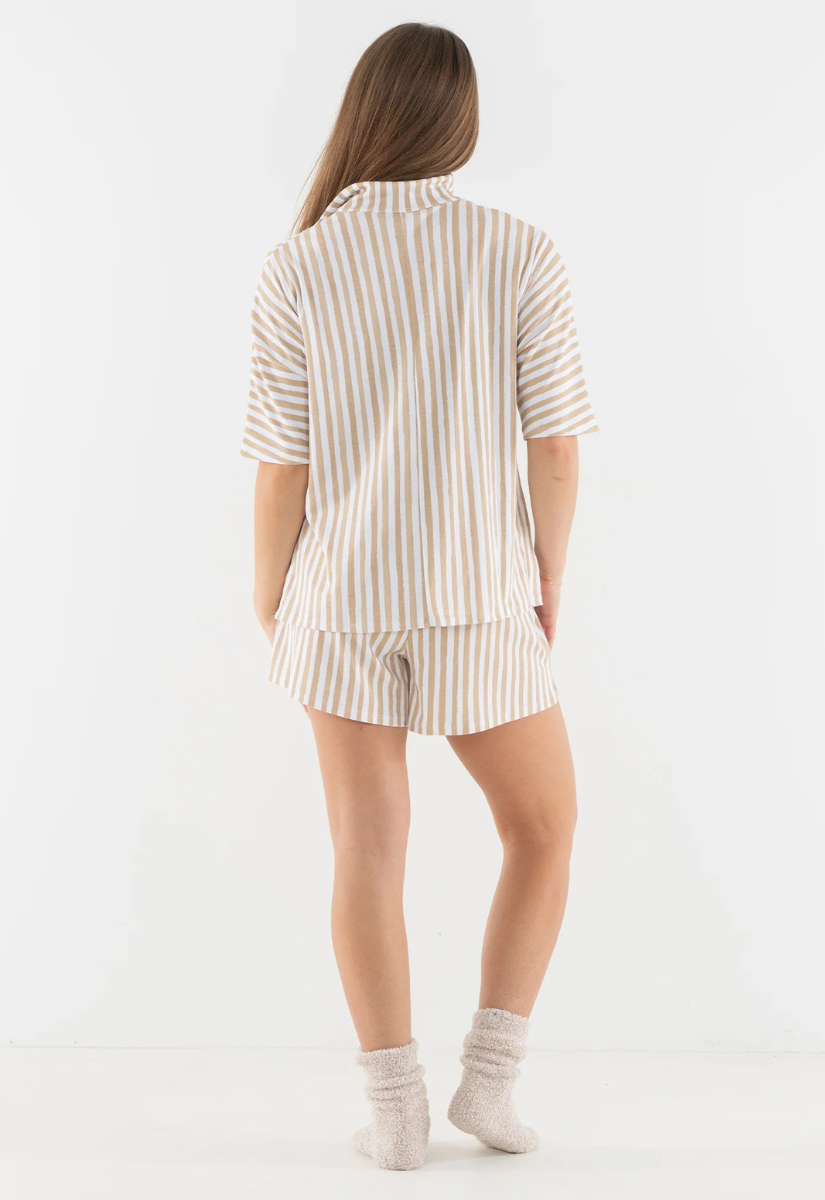 Our PJ Short Set in Sand Stripe is the perfect blend of comfort and refined style. The top features a classic stand collar, relaxed dolman sleeves, and an easy, loose silhouette for effortless wear. The matching shorts include a comfortable elastic waistband and relaxed fit—ideal for lounging or a restful night’s sleep. In a neutral sand and white palette, this set feels both seasonless and timeless, finished with our signature “invite joy” embroidery at the bottom corner for a thoughtful touch.