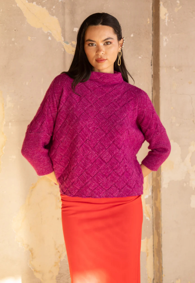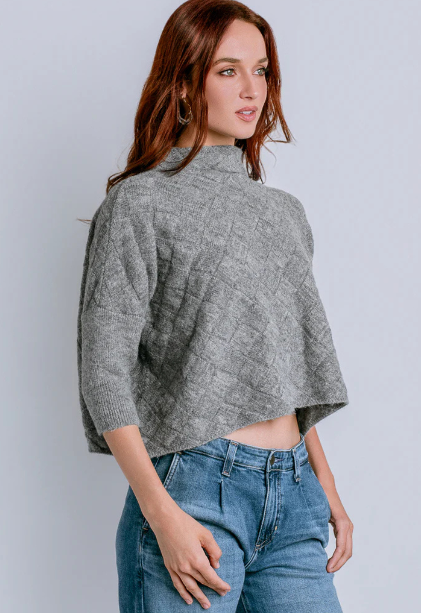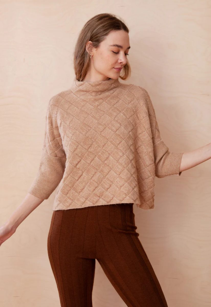Boxy mock neck top with fitted 3/4 sleeves in mega basketweave pattern in Eco-Yarn