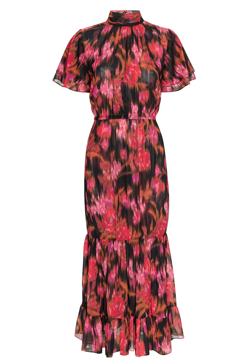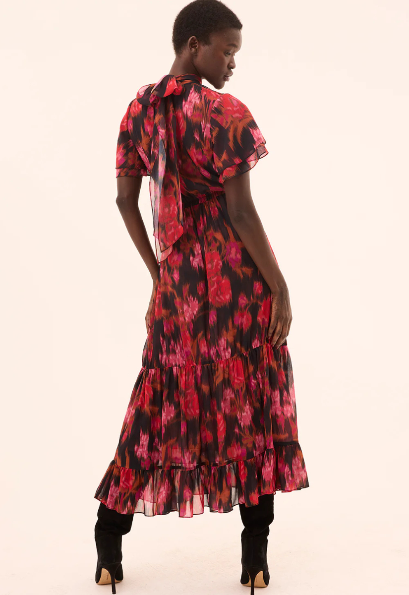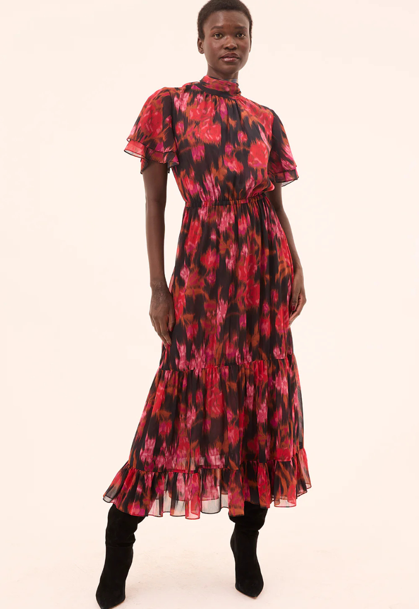 Safiya is a maxi-length version of our best-selling Saffie mini dress. Cut from vibrant red Blur Flora printed chiffon, it features a high mock neckline with a back tie closure and short double ruffle sleeves. Fully double lined, the flowing tiered skirt is finished with a ruffle hem and an elasticated waist for effortless comfort. The perfect dress to take you from fall to winter, it pairs beautifully with everything from heels to suede boots.