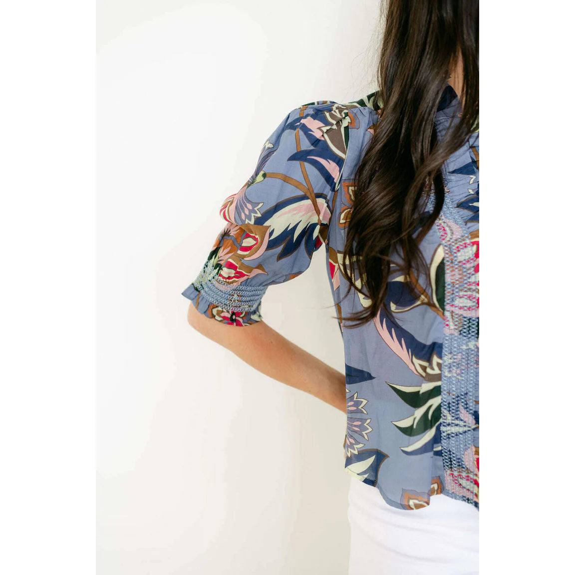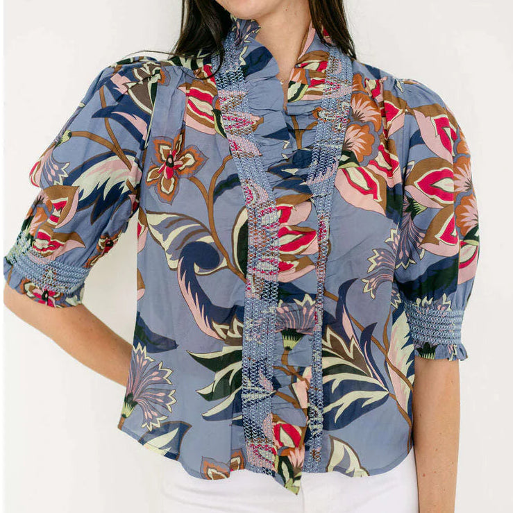 The Love The Label Zuri Top in Waltz of Flowers Print is a charming, feminine blouse that blends romantic details with easy-to-wear style. It features a bold floral pattern, a flattering V-neckline with ruffle and smocked trim, a button-down front, and short puff sleeves with smocked cuffs for a softly structured look