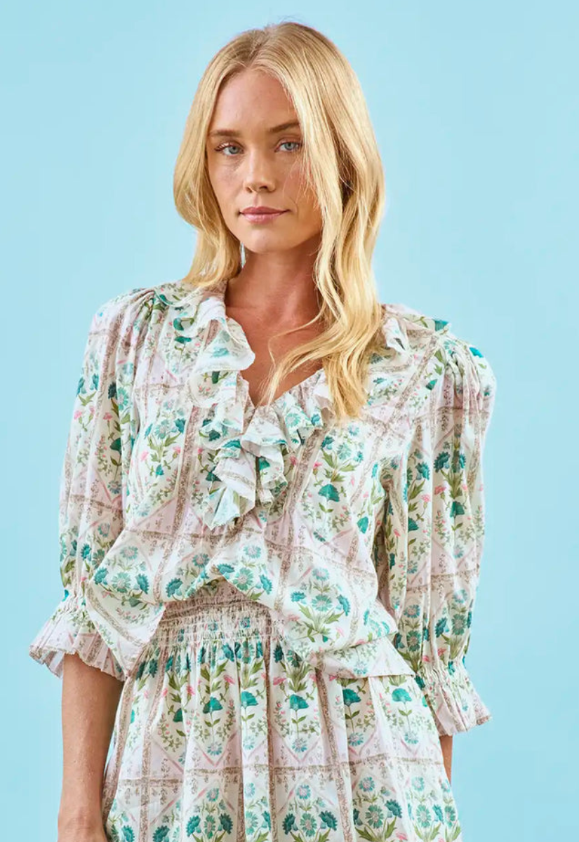 The Imogen Top is a feminine favorite, designed with thoughtful details that feel both delicate and refined. Crafted from lightweight cotton voile, it features soft pintucks, romantic ruffle accents along the V-neckline, and airy elbow-length sleeves. The result is a breezy, graceful silhouette.