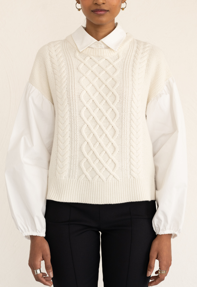 This Banjanan top is a unique hybrid design that combines a classic ivory cable-knit sweater with a crisp white shirt. The piece features a collared neckline and voluminous puff sleeves with elastic cuffs, creating a stylish layered look in a single garment.