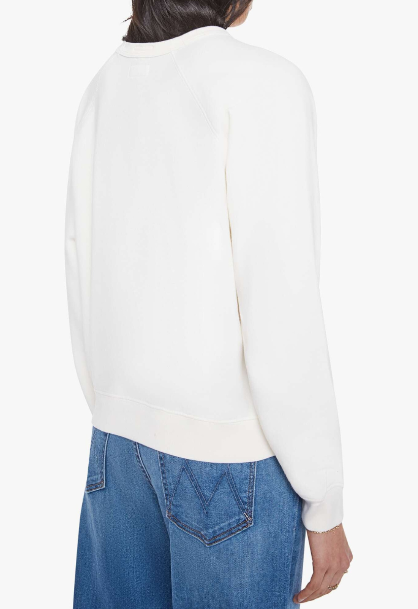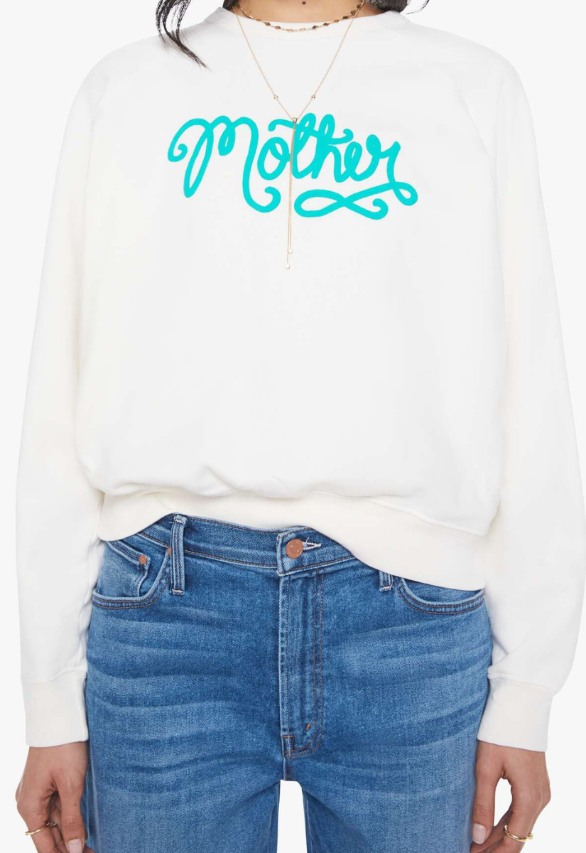 Signed, MOTHER. A raglan sweatshirt with a crewneck, ribbed hems and a slightly oversized fit. Made from super-soft 100% cotton, the sweatshirt is designed in white with MOTHER's name in a curly cursive teal font on the front.