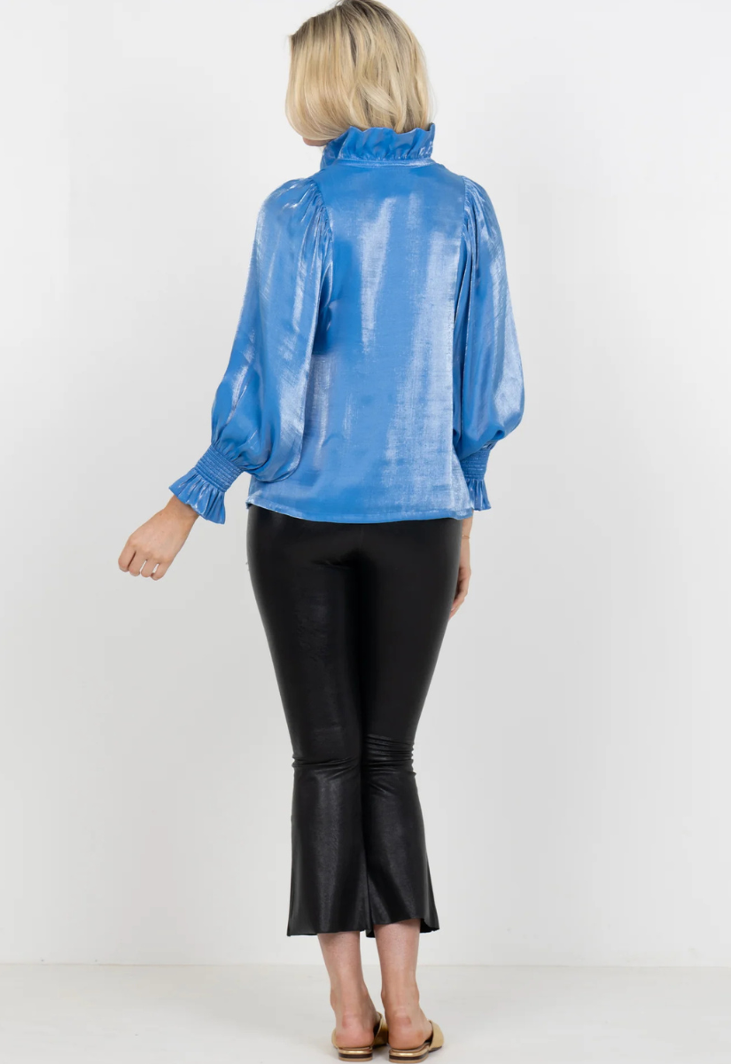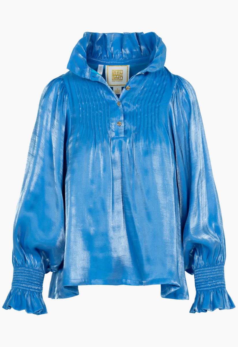 The Charlotte Top in Sapphire features a ruffled stand collar, pin tuck pleats along the front, smocked sleeves with ruffle cuffs, and a partial button front closure. Crafted in a silk blend, the fabrication is woven with shimmering threads that reflect light beautifully, adding subtle dimension to its fluid silhouette.