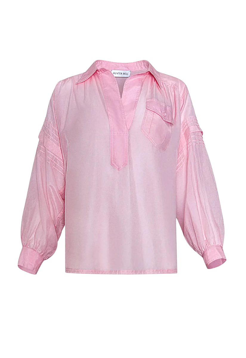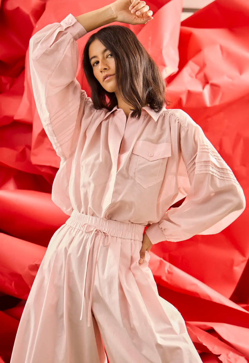 The Evangeline Shirt is an HB Basics essential that makes everyday dressing feel just a bit more special. Crafted in soft Pink Sand, this timeless staple features an open collared neckline, pleat detailing along the sleeves, a back yoke seam, and delicate gathering at the back and shoulders—subtle, thoughtful touches that elevate its classic feel.