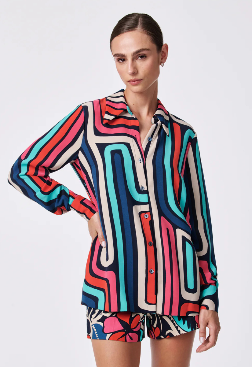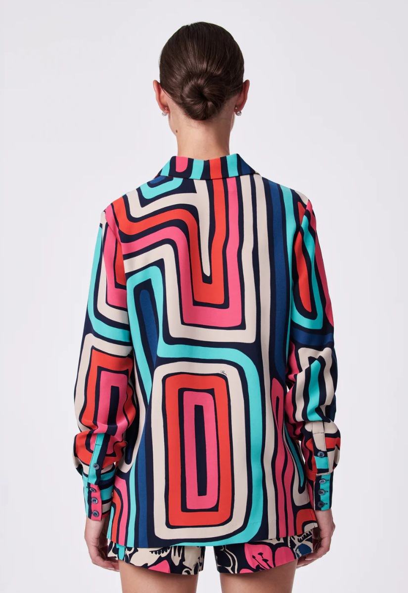 This bold print blouse is a chic staple that can be worn on breezy vacations or as a pop of print with work-ready outfits. It features a relaxed silhouette with long sleeves, a collar, and button front. This easy top is made of lightweight and drapey double georgette in a bold cubist print.