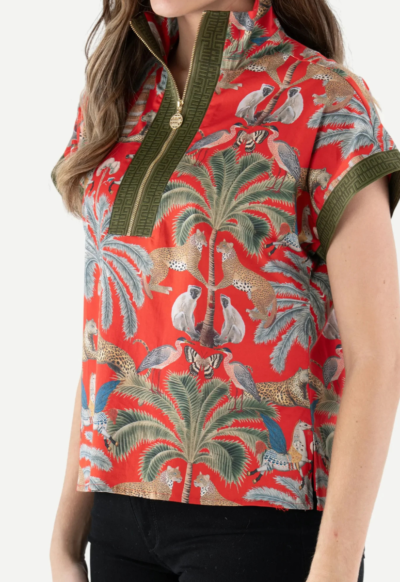 The Poppy Pullover by Emily McCarthy in the Monkee Maven print is a bold and vibrant statement piece featuring a lush jungle-inspired design of leopards, monkeys, and tropical palms. Crafted with a structured stand collar and a gold zip neckline, it blends playful elegance with modern sophistication. The olive green trim adds a refined touch, perfectly complementing the vivid red backdrop and intricate pattern.
