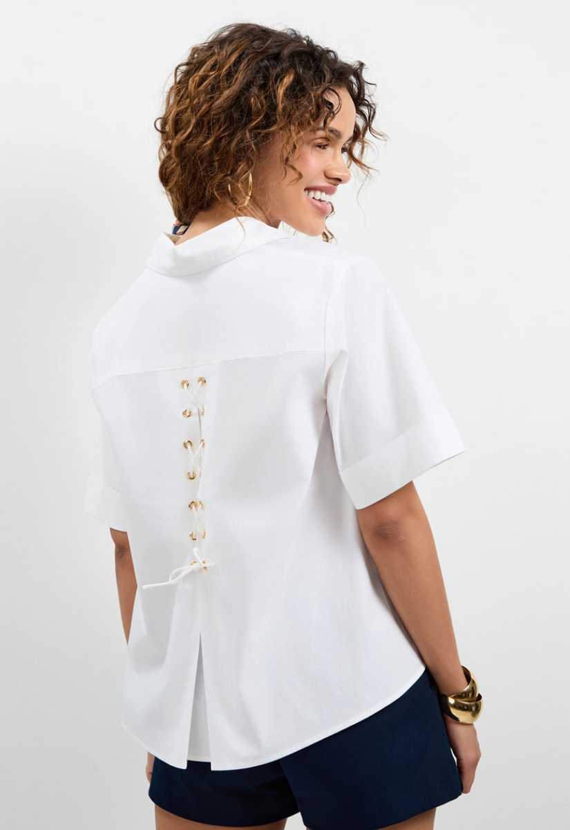This modern take on the classic button-down features a collar, button front, and lace-up detail in the back. It is made of crisp cotton-stretch poplin for cool wear on warm days.