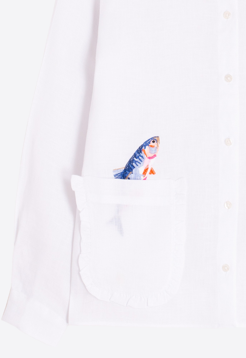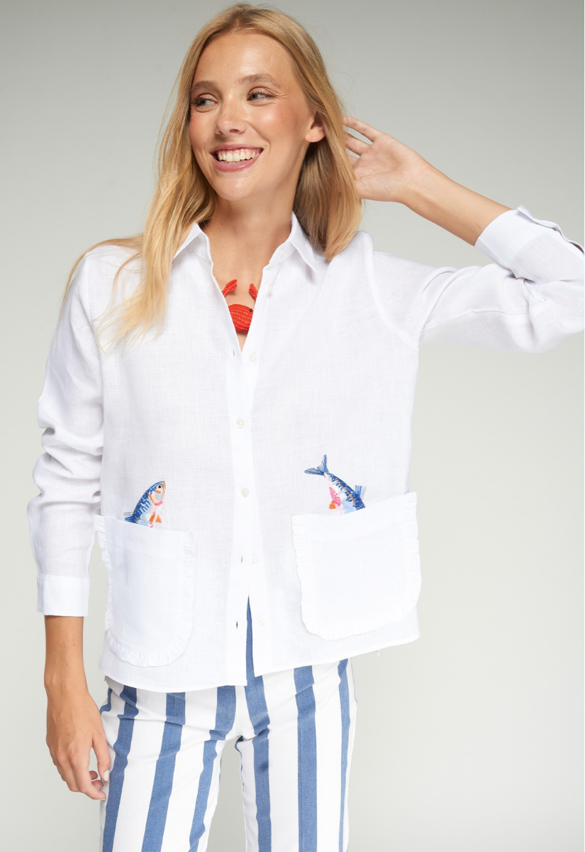 - Whimsical fish embroidery peeking from each pocket