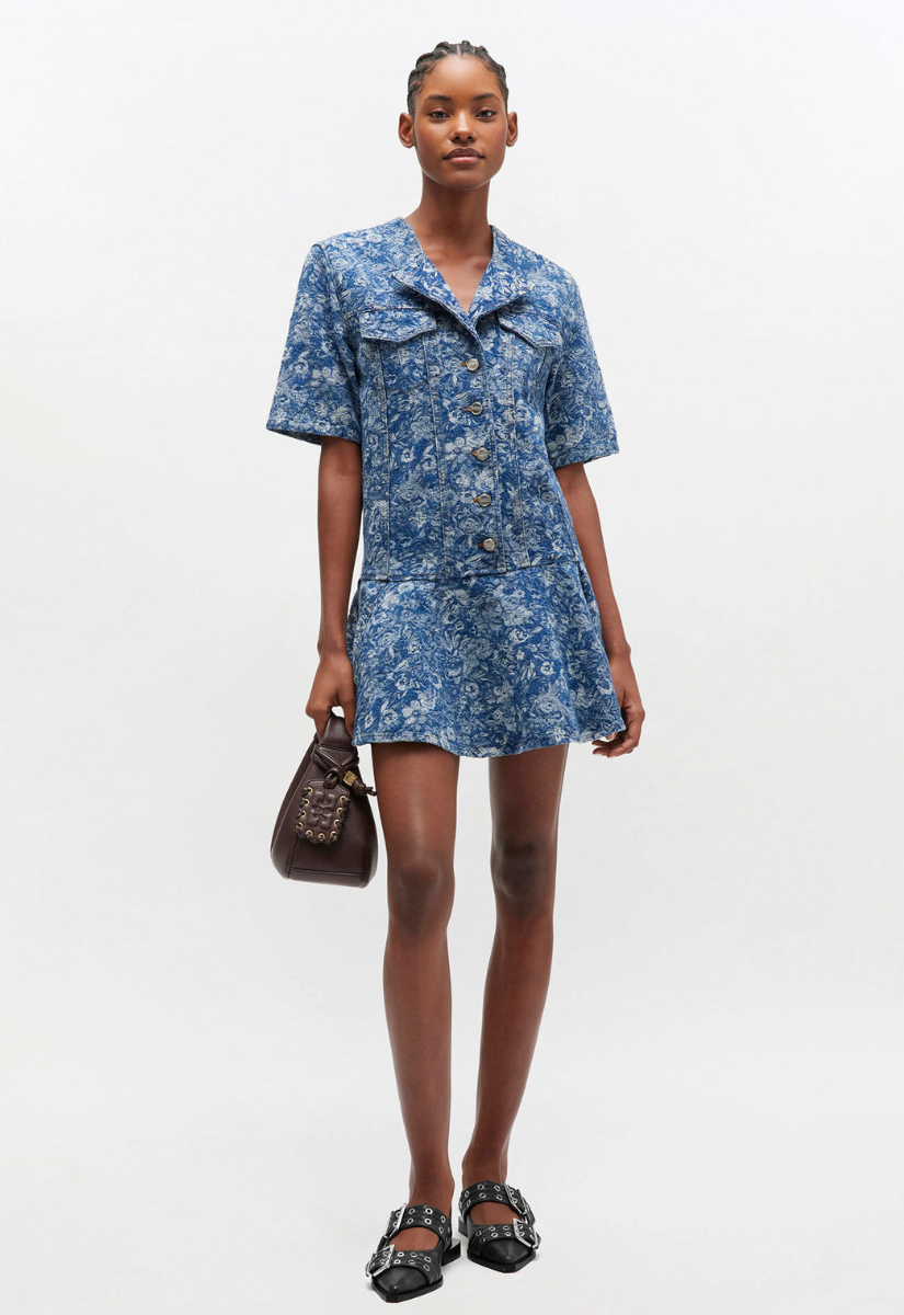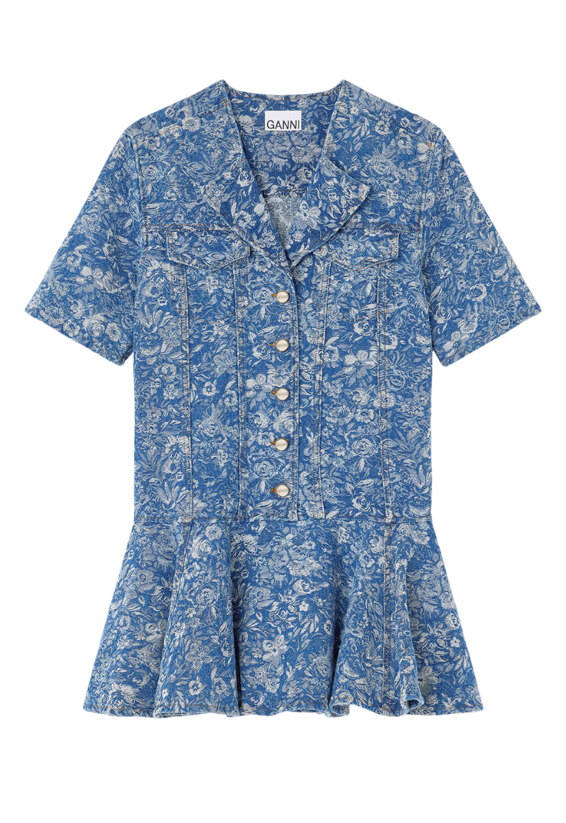 This dress features a v-neckline, button-front closure, chest pockets and a ruffled hem.