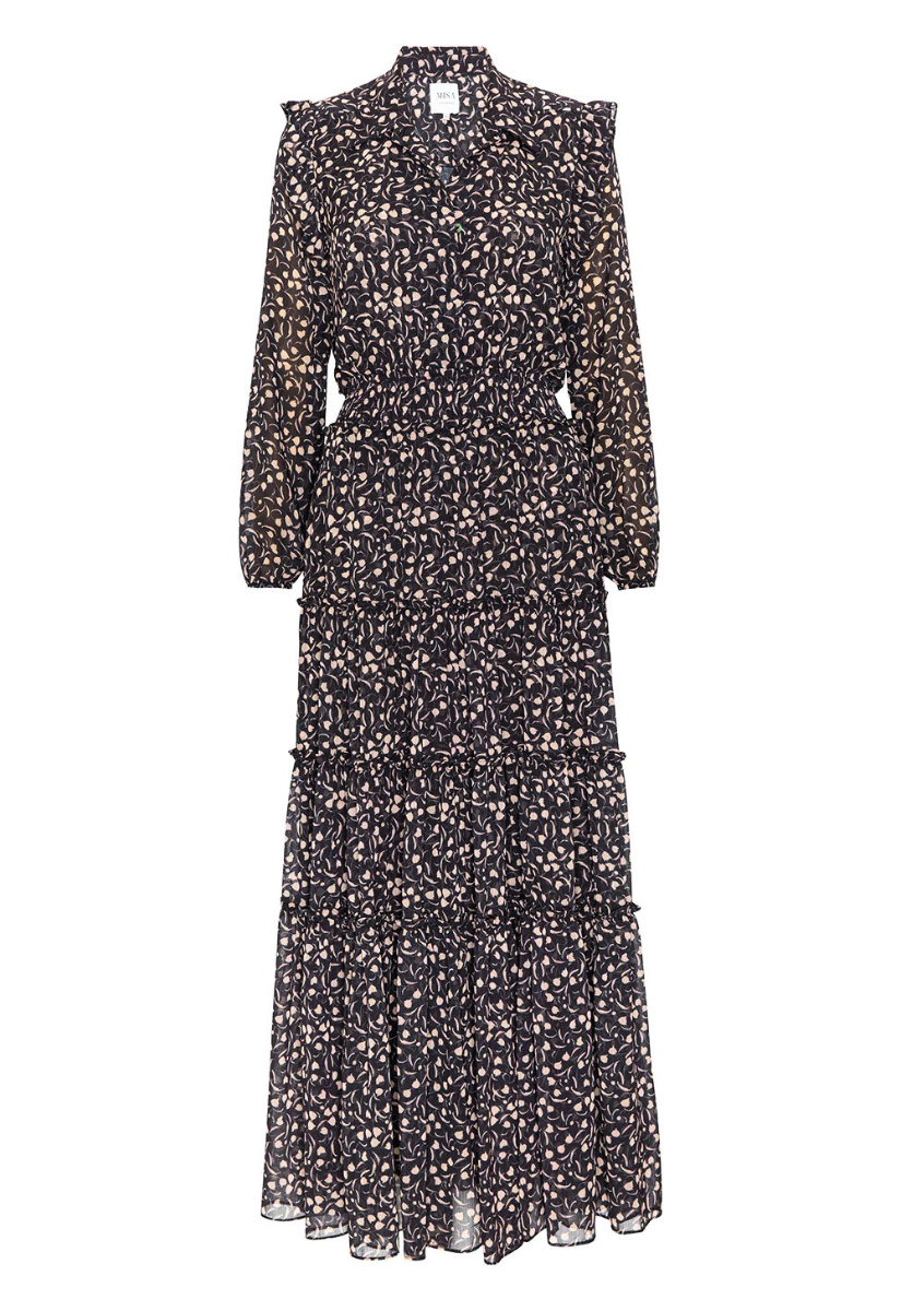 Misa's universally flattering Ahreana returns for fall in a Tulipina-printed chiffon with the perfect autumn palette. This feminine take on the shirt dress features a covered button placket through the bodice and an elasticated waist for comfort and shape. A fold-over collar and delicate ruffle shoulders frame the long semi-sheer sleeves, while a back placket ruffle adds subtle charm. The bodice and skirt are self-lined, cascading into a tiered, ankle-grazing silhouette—timeless and versatile.