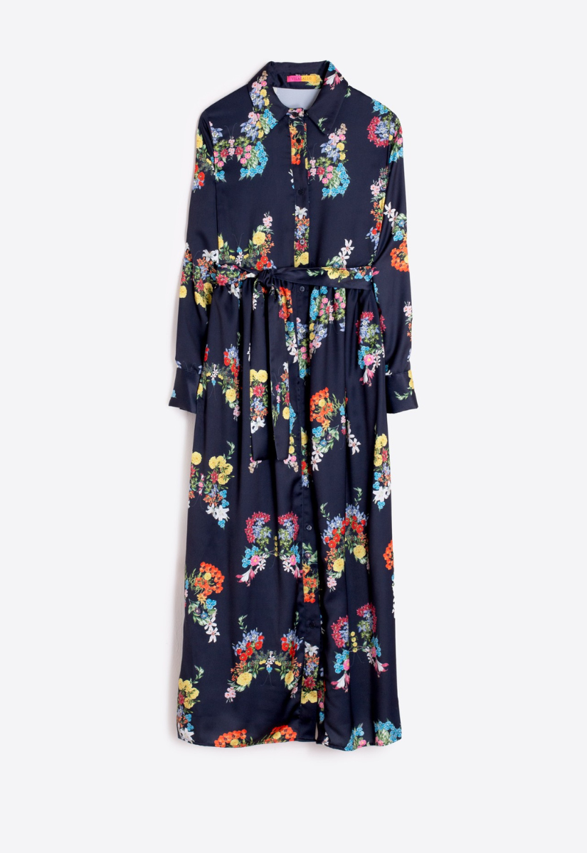 Long shirt dress in navy blue with colorful butterfly floral print. Classic collar, long sleeves with buttoned cuffs, and full front button closure. Straight cut with matching fabric belt.