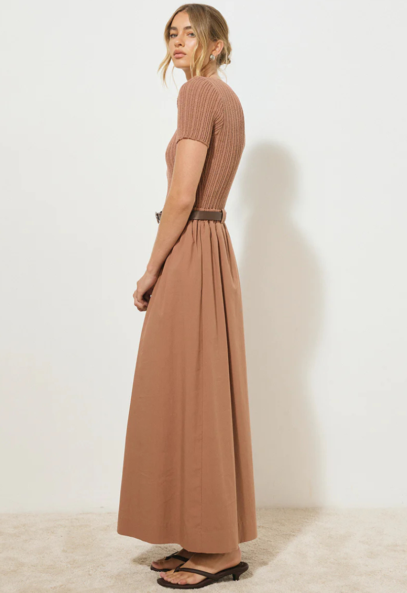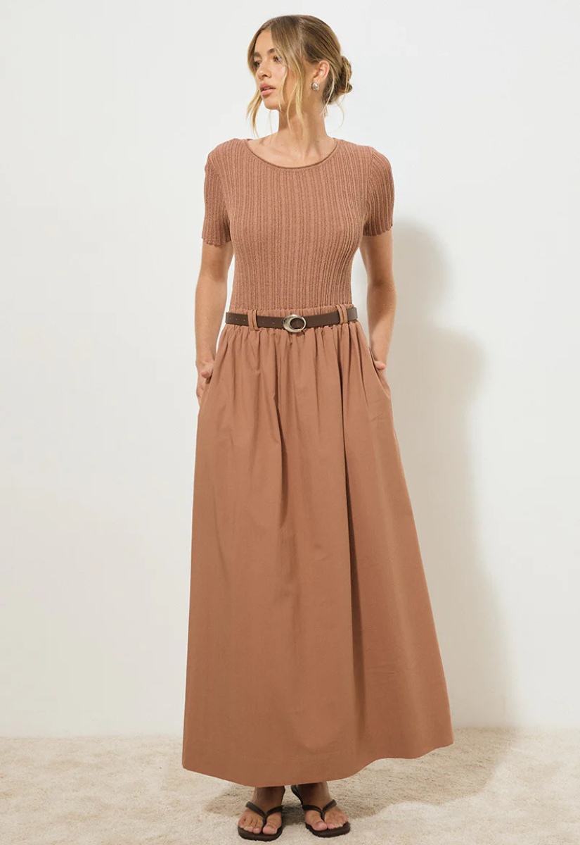 This midi dress features a fitted, short-sleeve knit bodice with a wide round neckline. It transitions into a full, gathered woven skirt with a wide waistband, belt loops, and an elasticated waist for a comfortable, adjustable fit.