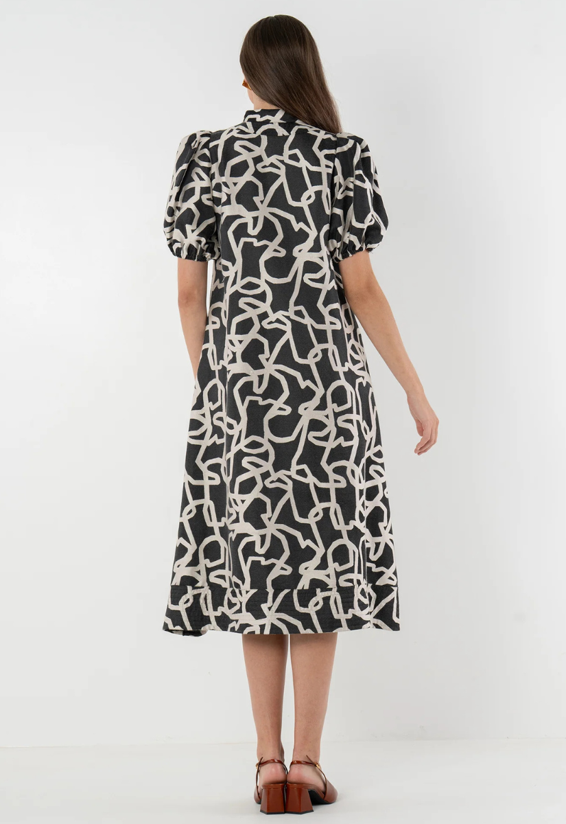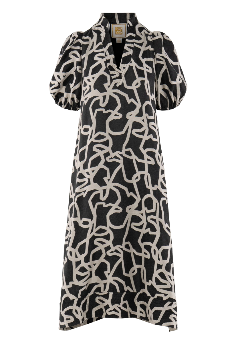 The Hampton Dress in Boot Print showcases an abstract pattern created from interlocking boot outlines, a nod to western heritage reimagined with modern flair. The black and ivory woven fabric adds soft texture and visual dimension, giving the design depth and character. This midi-length silhouette features a mandarin collar, V-neckline, puff sleeves, and a trapunto-stitched hem, finished with functional side seam pockets for effortless wear.