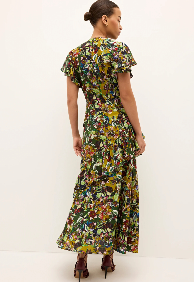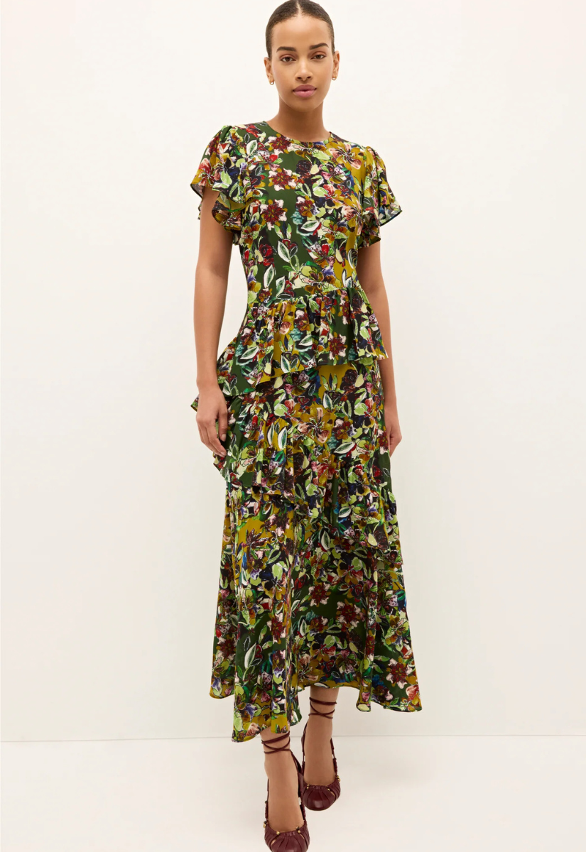Your new fall occasion dress has arrived in all of Quinby's tiered, flounced, and floral splendor. Airy silk mix meets bloom, our painterly fall scorchd botanical print that will be the star of every party. The flattering effect of the fitted top that cascades into a ruffled skirt is both comfortable and effortlessly versatile, taking you from baby to bridal shower or an elevated date night.