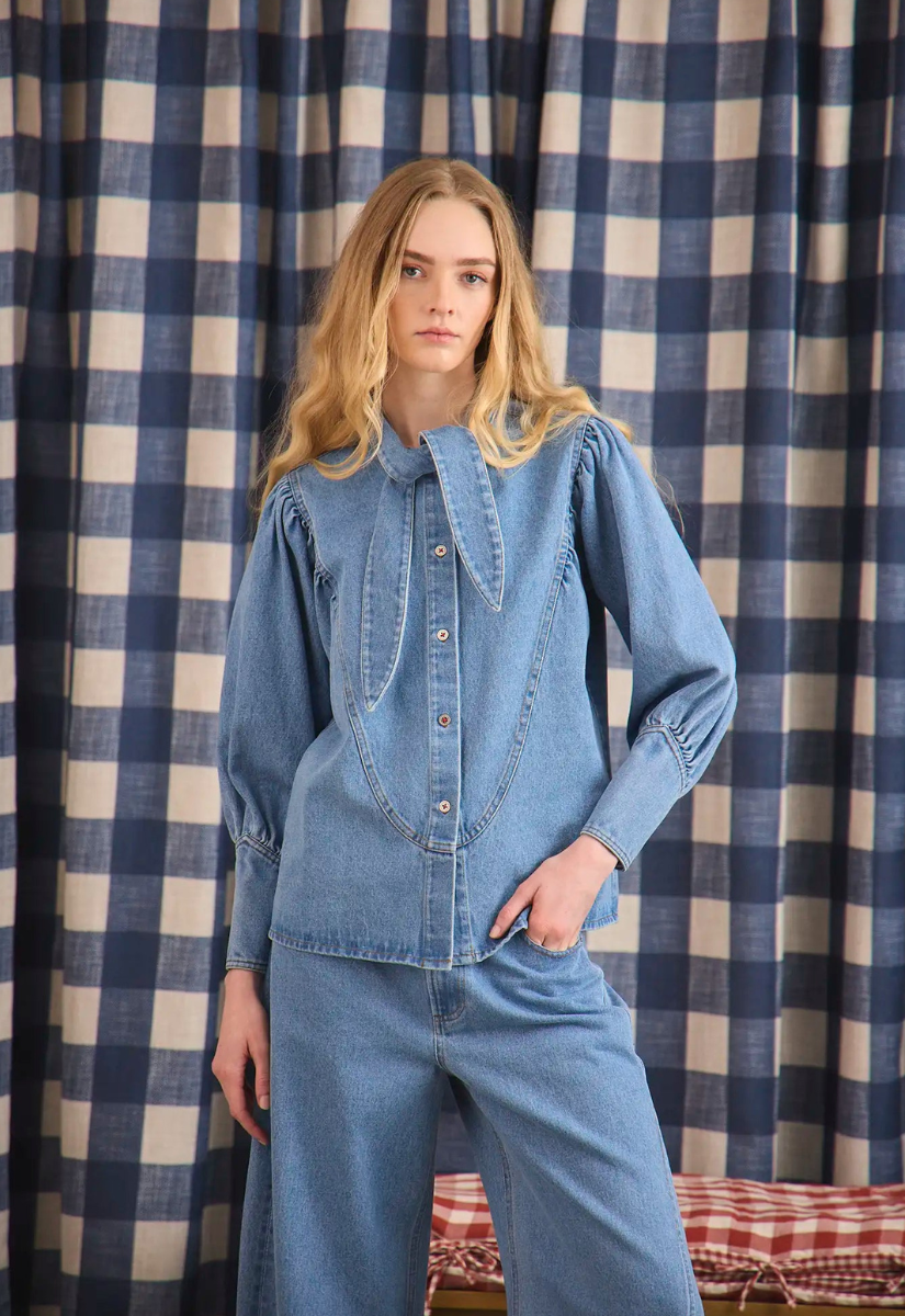 The Odessa Shirt in vintage denim blends classic Western influences with a distinctly feminine touch. Designed with a bold tie neckline, statement curved front yoke, and puffed long sleeves with button cuffs, it strikes the perfect balance of structure and softness. Crafted from 100% cotton denim with traditional seaming and a polished button-front closure, it’s a versatile piece that feels both timeless and modern.