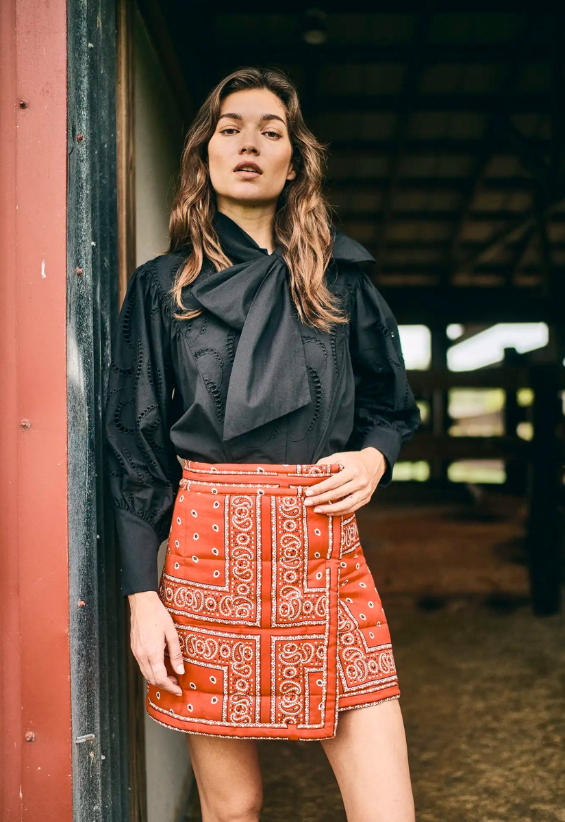 The Powell Skirt returns this season in our Aces Wild bandana print, perfect for elevated fall dressing. Designed with a banded waist and sleek wrap silhouette, it fastens with a discreet snap closure for a clean, polished finish. A true statement piece, Powell moves seamlessly from day to night.