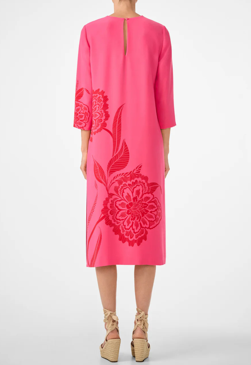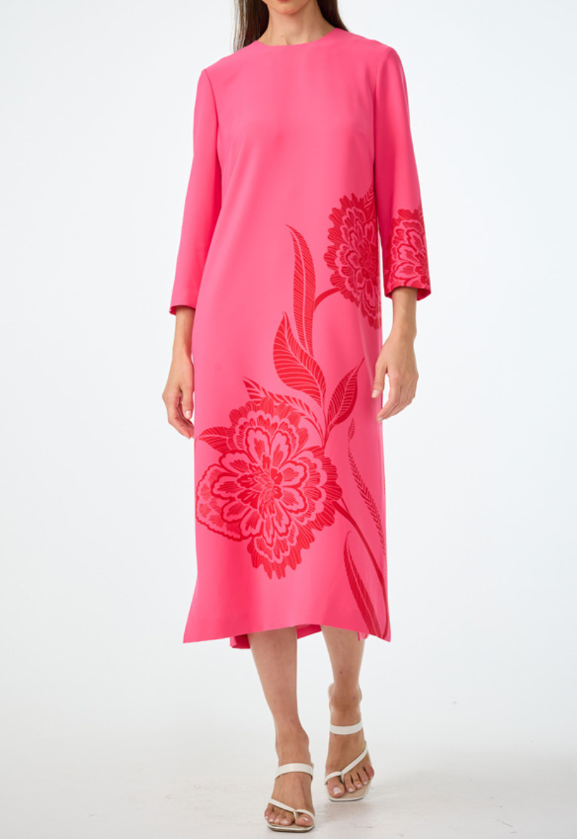 This flattering, slim dress has a classic silhouette and a feminine floral print. With a midi length, 3/4-length sleeves and side slits for ease of wear, this dress is finished with a round neckline and button closure at the back neck.