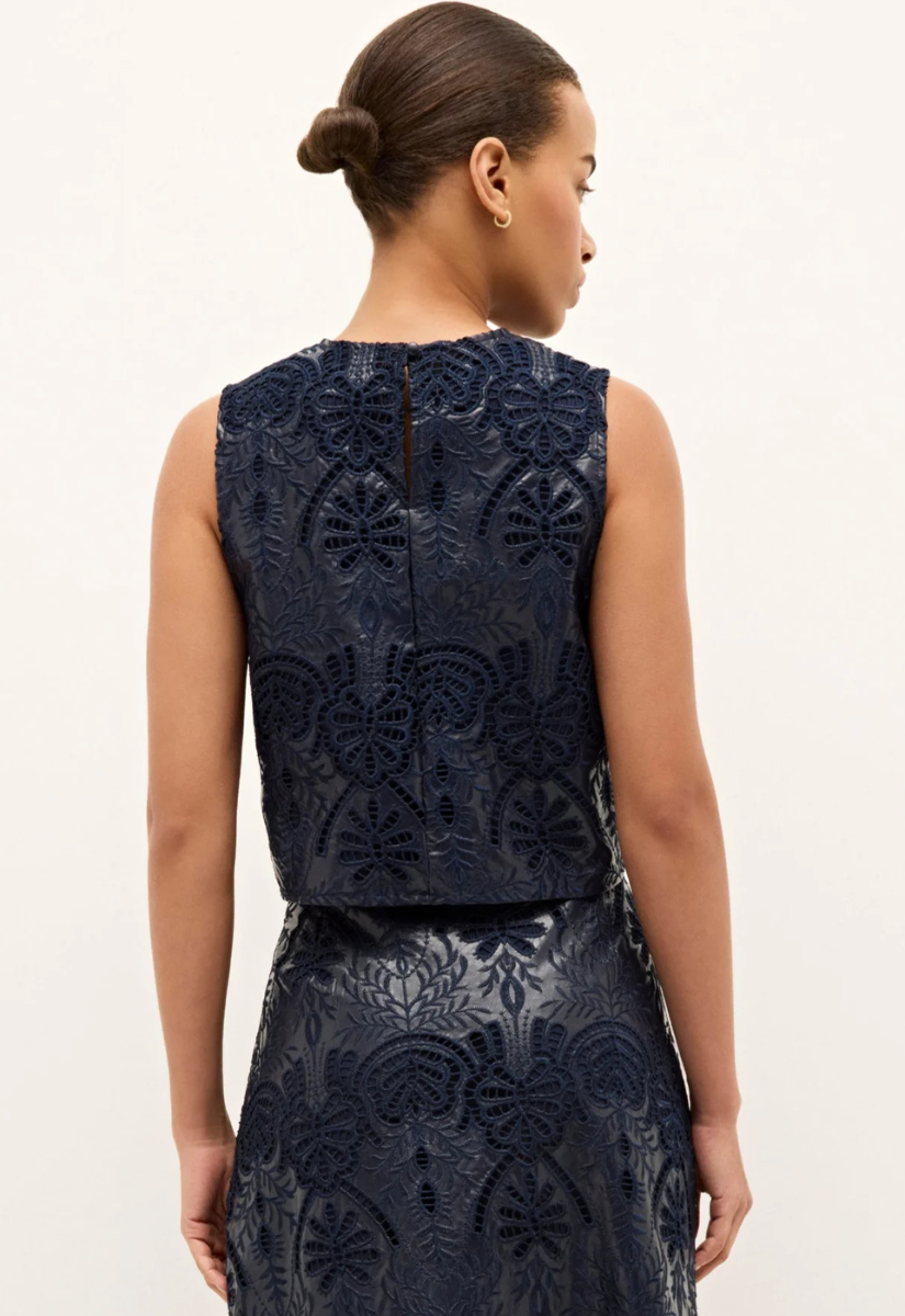 The latest iteration of our popular Davis top combines the edginess of (vegan) leather and the elegance of lace with a unique laser-cut texture, and a subtle metallic sheen that elevates the look.