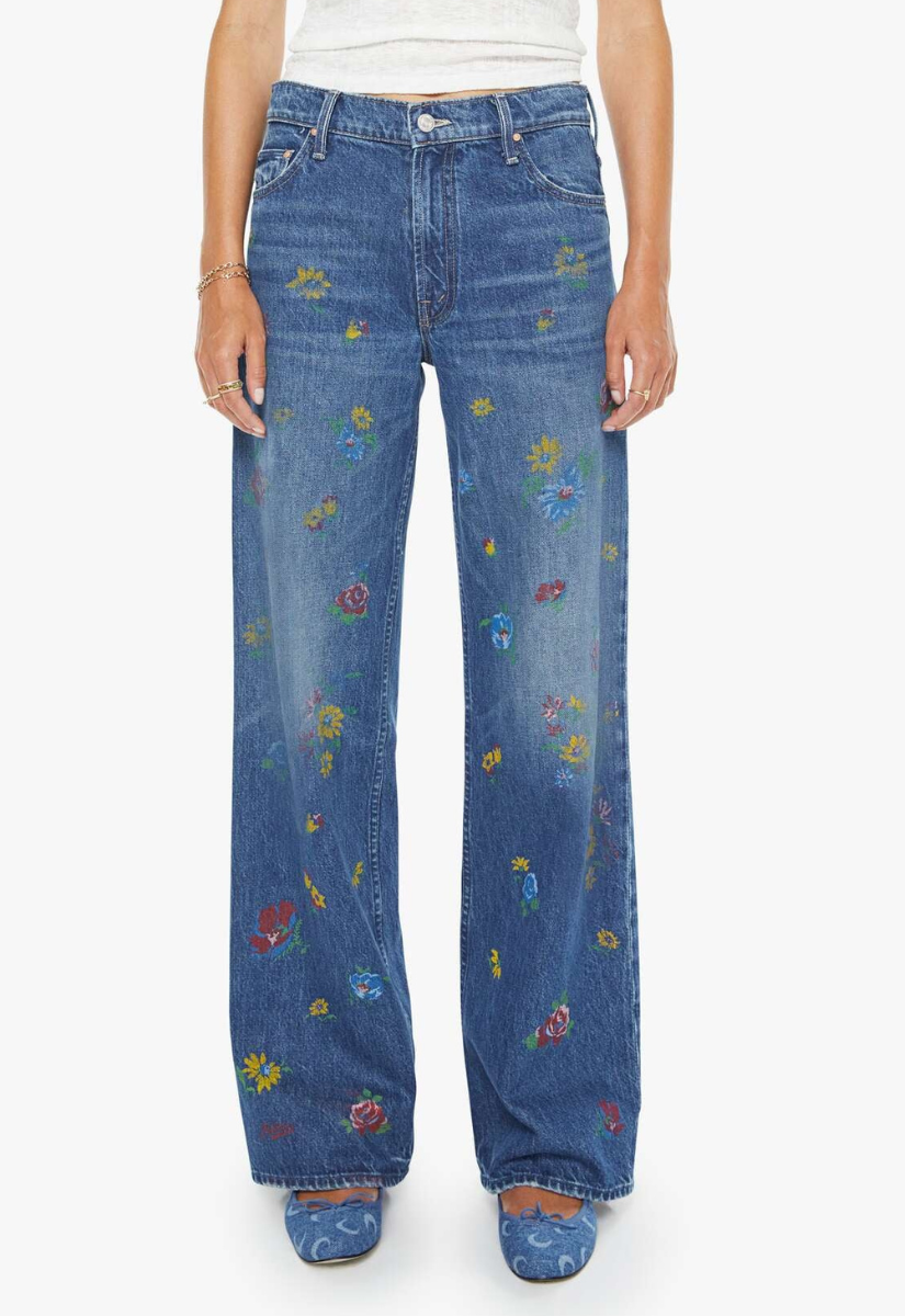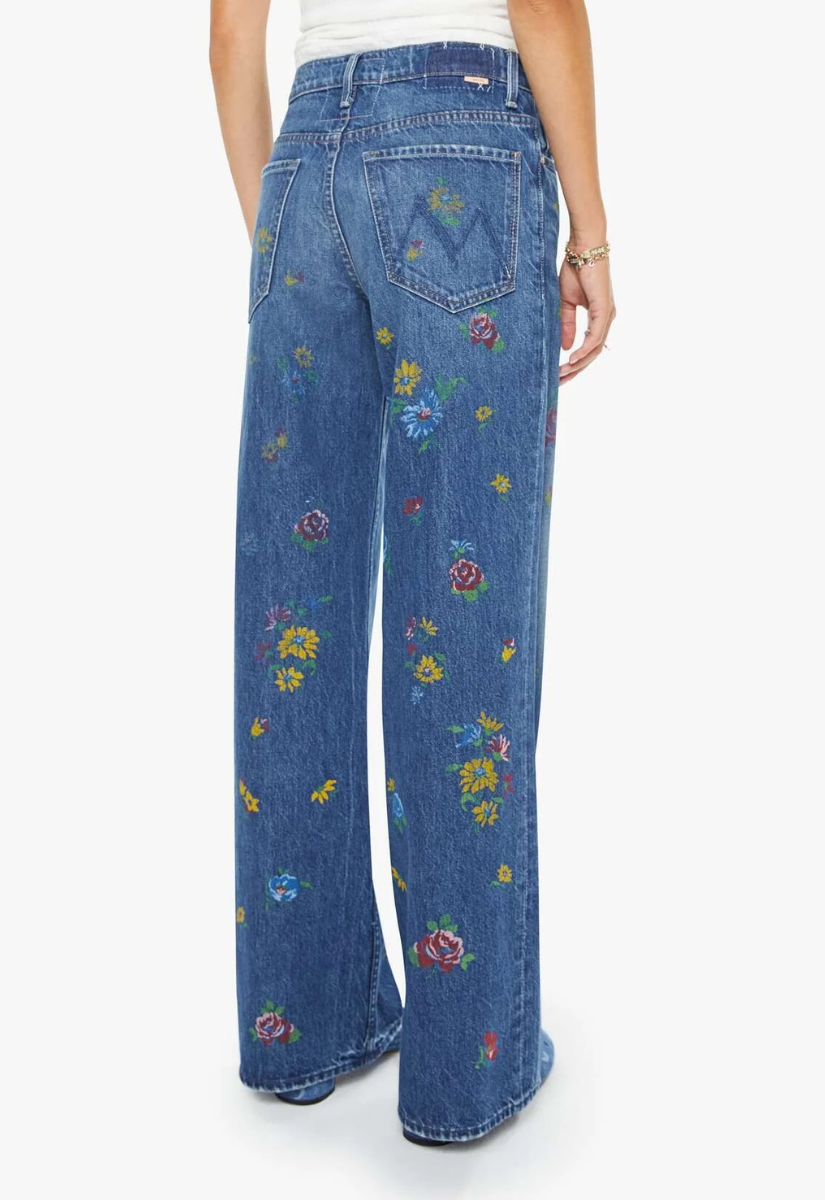 High-waisted wide leg jeans with a zip fly, 29-inch inseam and loose, low-slung fit. Made from rigid SUPERIOR denim, Field Of Flowers is a mid-blue with yellow, red and blue flowers throughout.