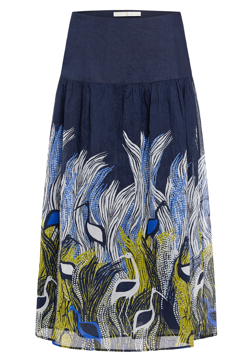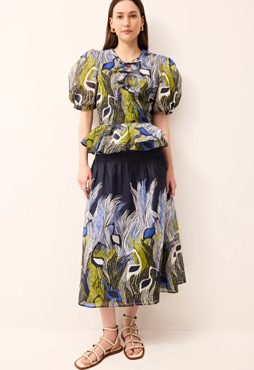 A refined drop waist and subtle texture define the midi-length Owens skirt, creating an elevated foundation for warm-weather dressing. Together with the matching Estella top, the set is finished in Heron, an abstract avian placement print with chartreuse, cobalt, and white details on navy.