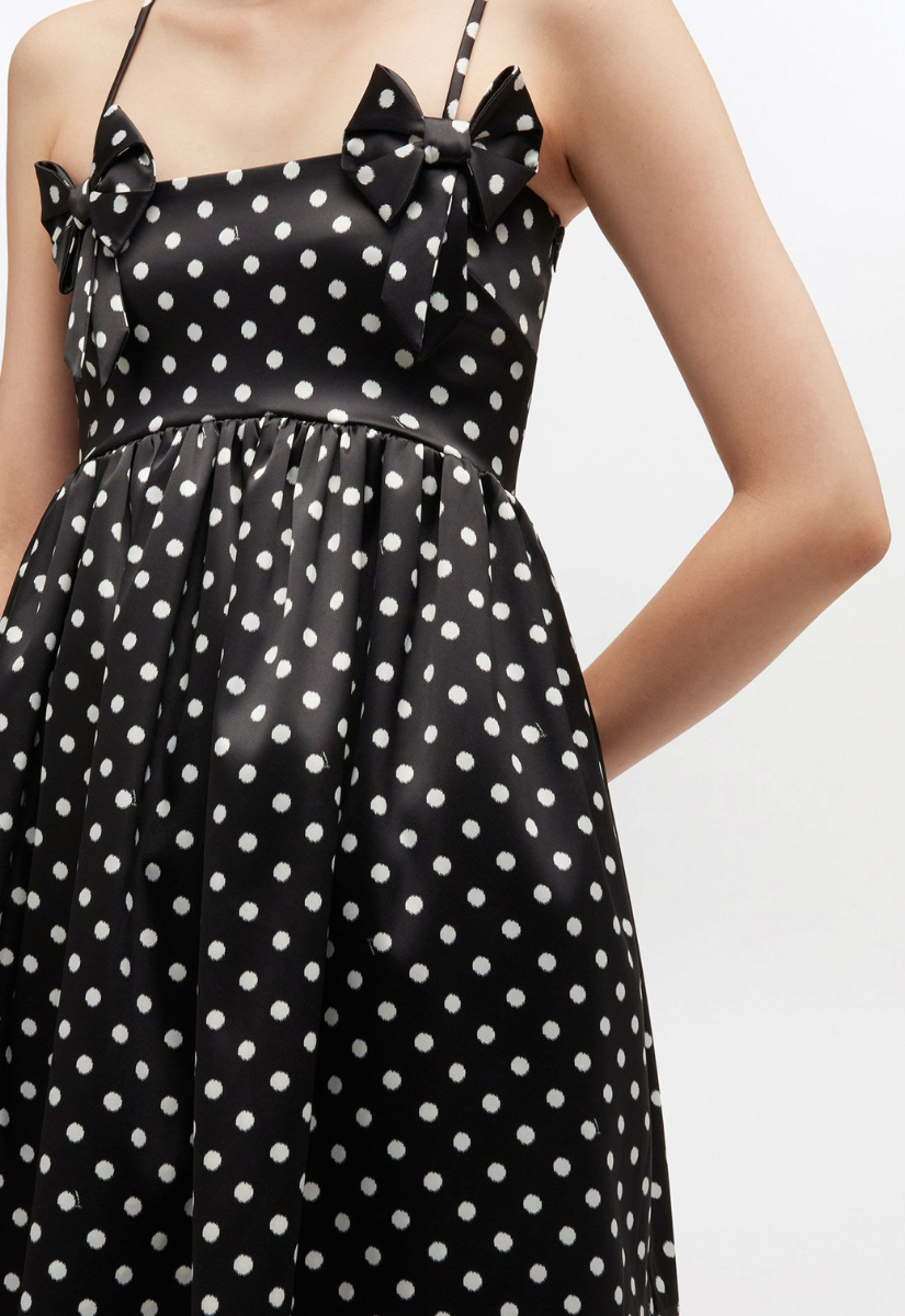 This dress feature spaghetti straps, zipper closure, an elastic back panel and a bow detail at the front.