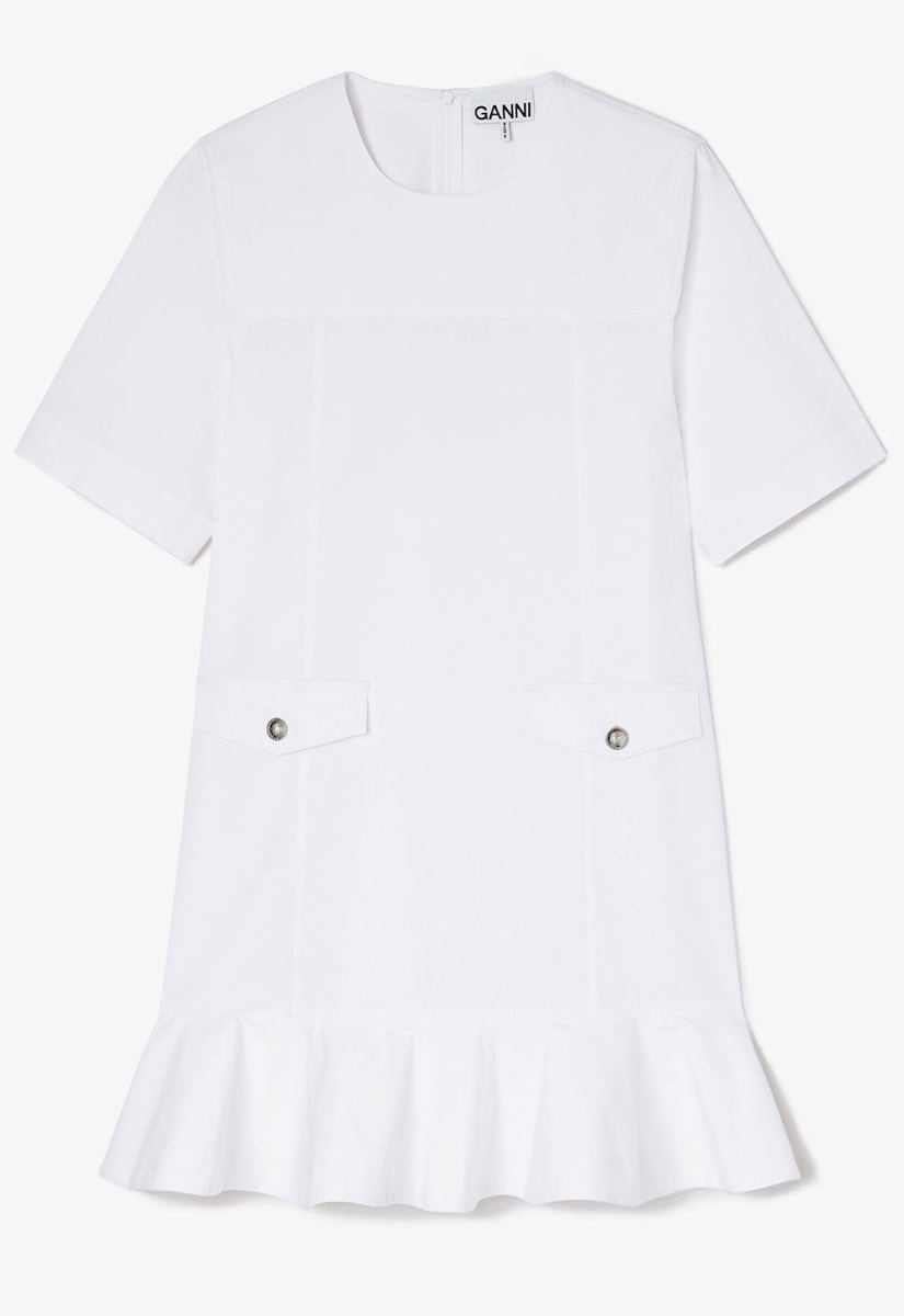 This dress features a round neck, pockets, a ruffle hem detail and a zipper closure at the back.