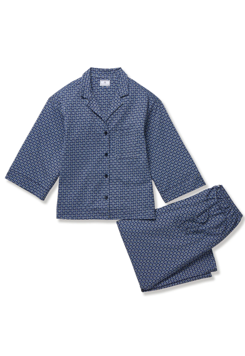 Our wide-leg Pima Cotton pajama set is the apex of comfort and feminine tailoring: a well-considered three-quarter length sleeve, for example, and a more generous pant leg that results in that refined swish-swish sensation at your ankle as you walk down a long hallway.