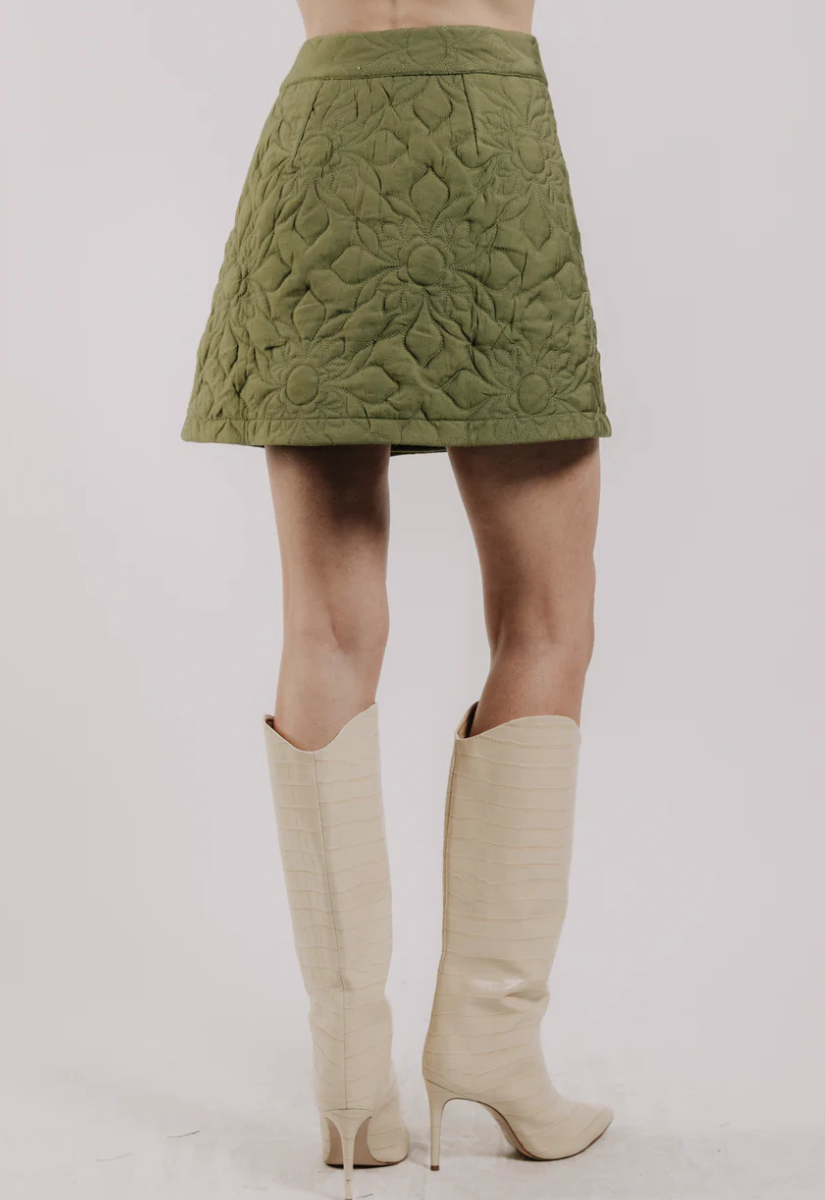 The Melanie Quilted Skirt is crafted in a soft olive quilt with floral stitching detail, designed in a flattering A-line silhouette.