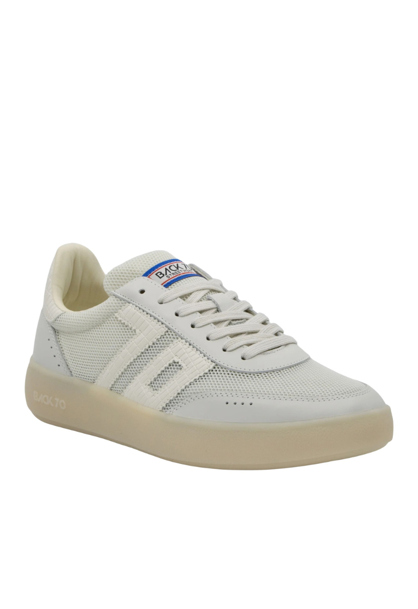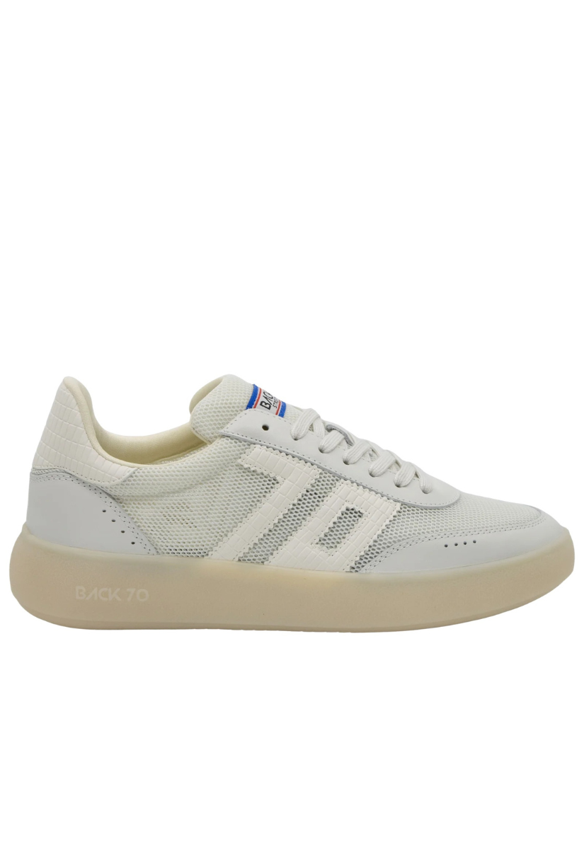 The Brooklyn M26 platform sneaker in an effervescent white mesh and leather elevates sporty minimalism with a light, airy touch. Its translucent body combines effortless breathability with subtle leather accents, while the refined platform sole adds just the right amount of lift. Finished with the original Back 70 logo patch on the tongue, this style blends vintage athletic inspiration with delicate sophistication — perfect for women seeking a soft, elevated, and modern sneaker.