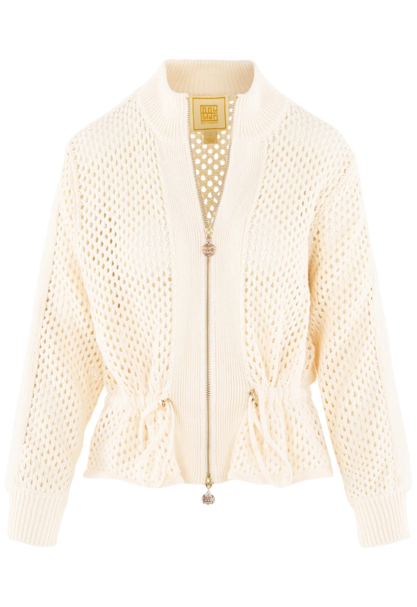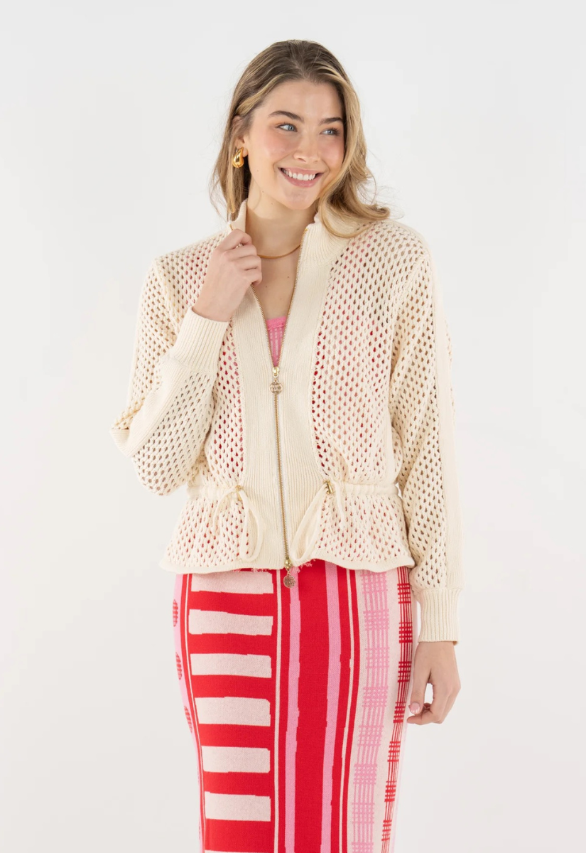 The Bailey Bomber in Sandshell Knit is a fresh take on a classic silhouette, designed for effortless layering. Crafted in an open-weave knit, this lightweight style features an adjustable drawstring waist for a customizable fit, a two-way zipper finished with our signature logo pulls, and a timeless stand collar. Easy and versatile, it is the perfect throw-on piece for sunny days on the go, offering breathable comfort with a polished, elevated finish.