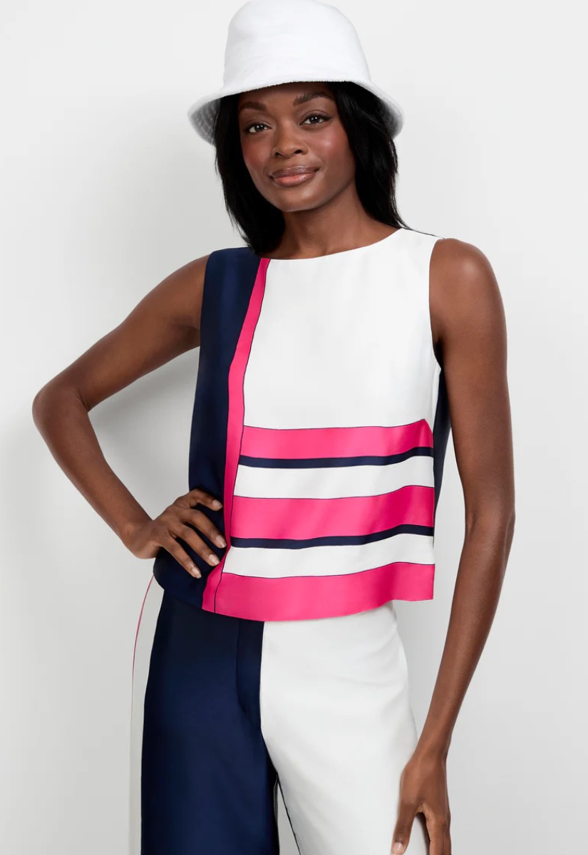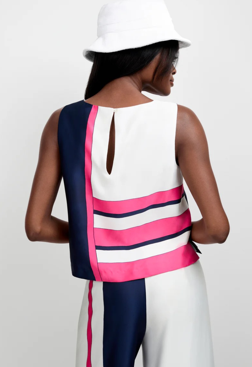 Soon you'll feel the sun on your shoulders in this striped, sleeveless top. Featuring an elevated striped pattern and a pop of color, this spring-ready crewneck top is made of breezy satin georgette that moves with you.