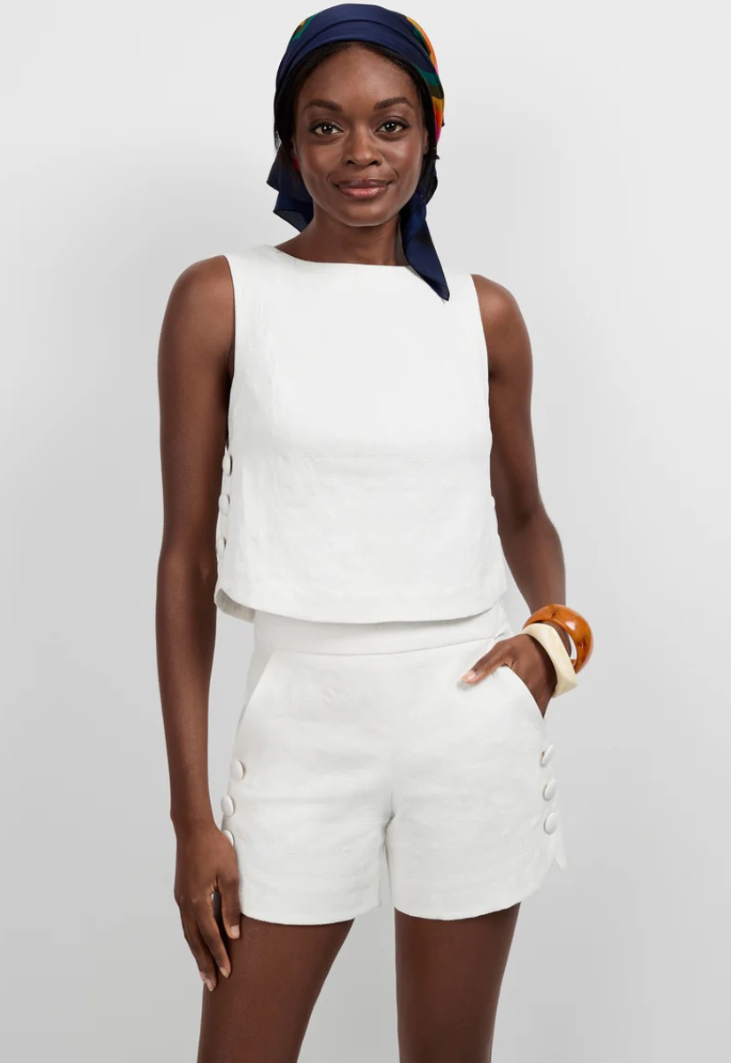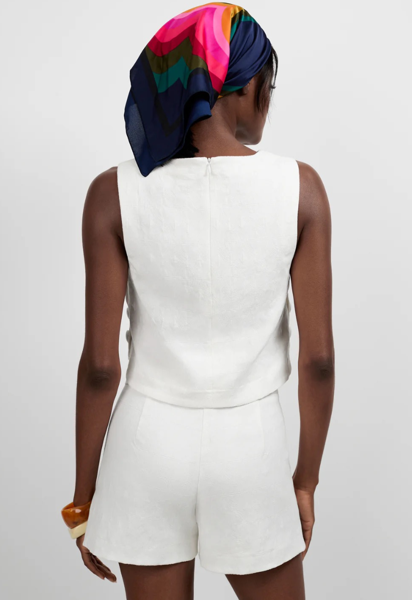 This chic structured top is made from stretch-cotton jacquard that keeps the fit smooth and snug. It features a boatneck, bust darts, a hidden back zip closure and a curved hem detailed by buttons.