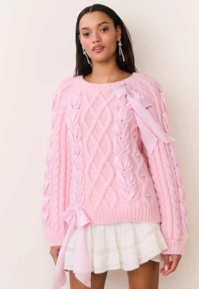 Introducing the Kloss Pullover. Designed from a baby alpaca wool blend, this piece has a plush, cozy feel. With a slightly longer body, an updated front cable stitch, and coordinating dyed satin ribbons woven throughout, it’s a perfect balance of texture and feminine detail.
