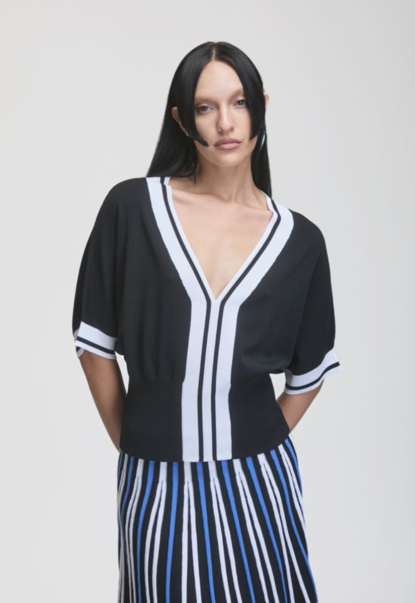 V-neck top with short sleeves, fitted midriff, front and edge striping accents