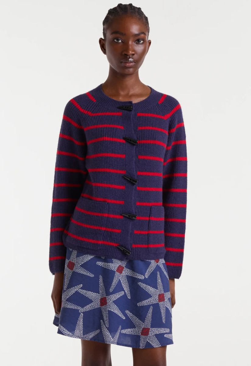 Knit cardigan with a navy blue and red striped print. Round neck and long sleeves. Trench-style front closure. Front pockets.