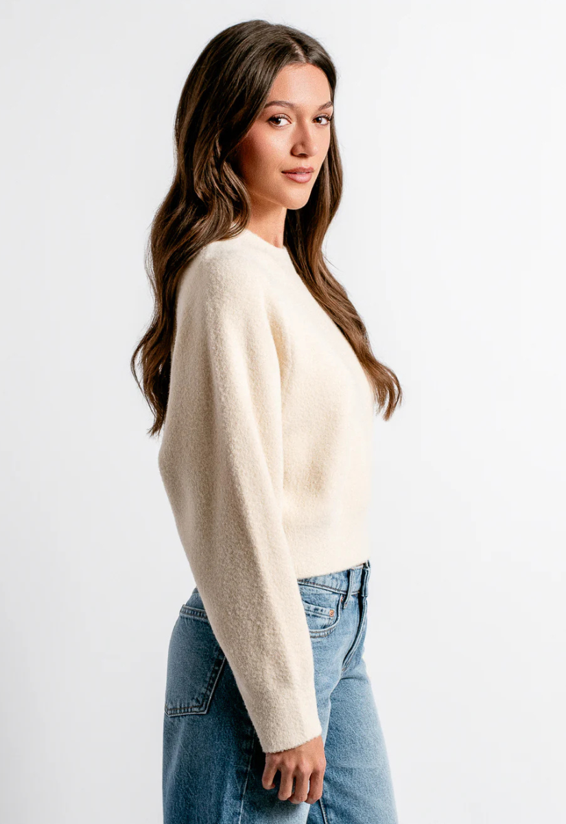 Cozy and plush, the above hip length can be freely styled with a high-waisted skirt or jeans.