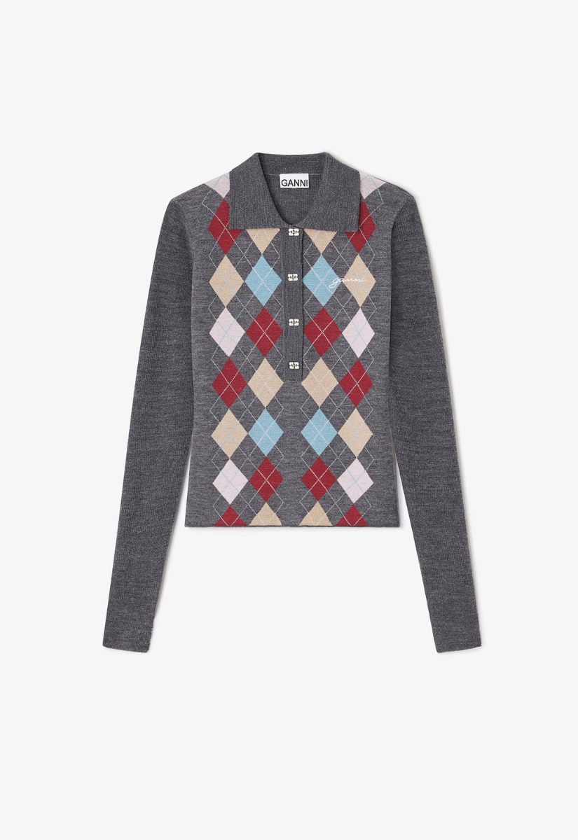 This polo shirt features an argyle print, collar, long sleeves and a button placket with GANNI Butterfly buttons.