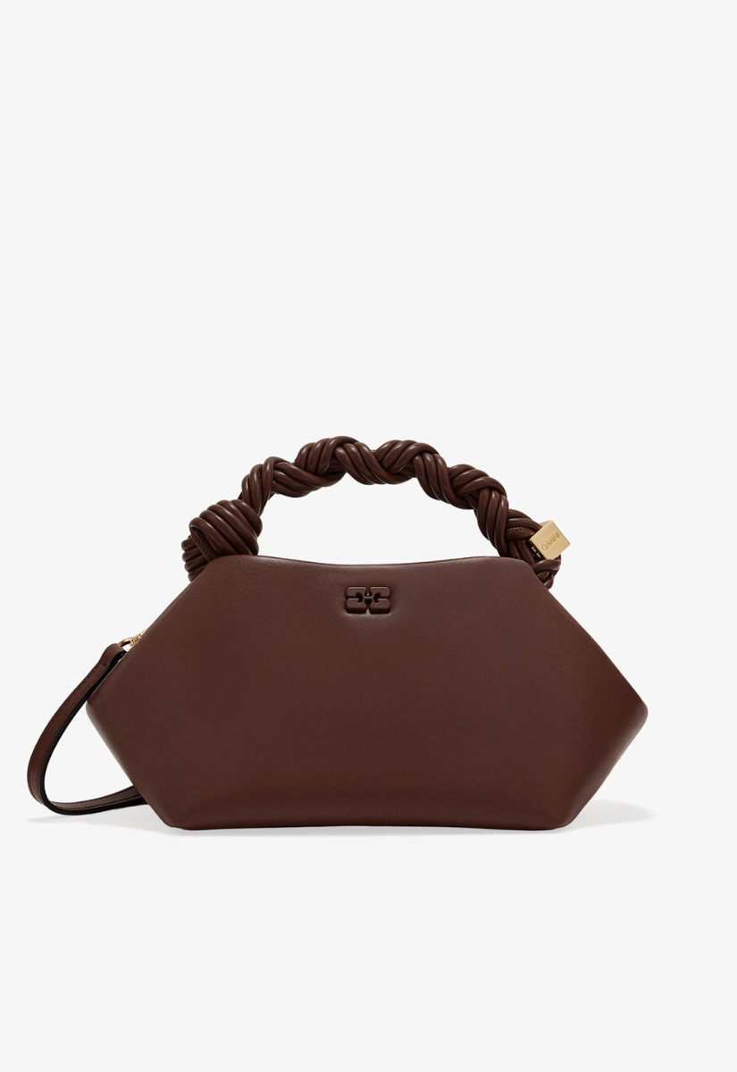 This bag features a tone-on-tone metallic GANNI Butterfly logo, a twisted handle with a braided knot, and a gold-tone metallic dice with a GANNI Butterfly logo engraved. The bag has an internal magnetic closure, a flat card pocket inside, and an adjustable and removable shoulder strap for crossbody wear.